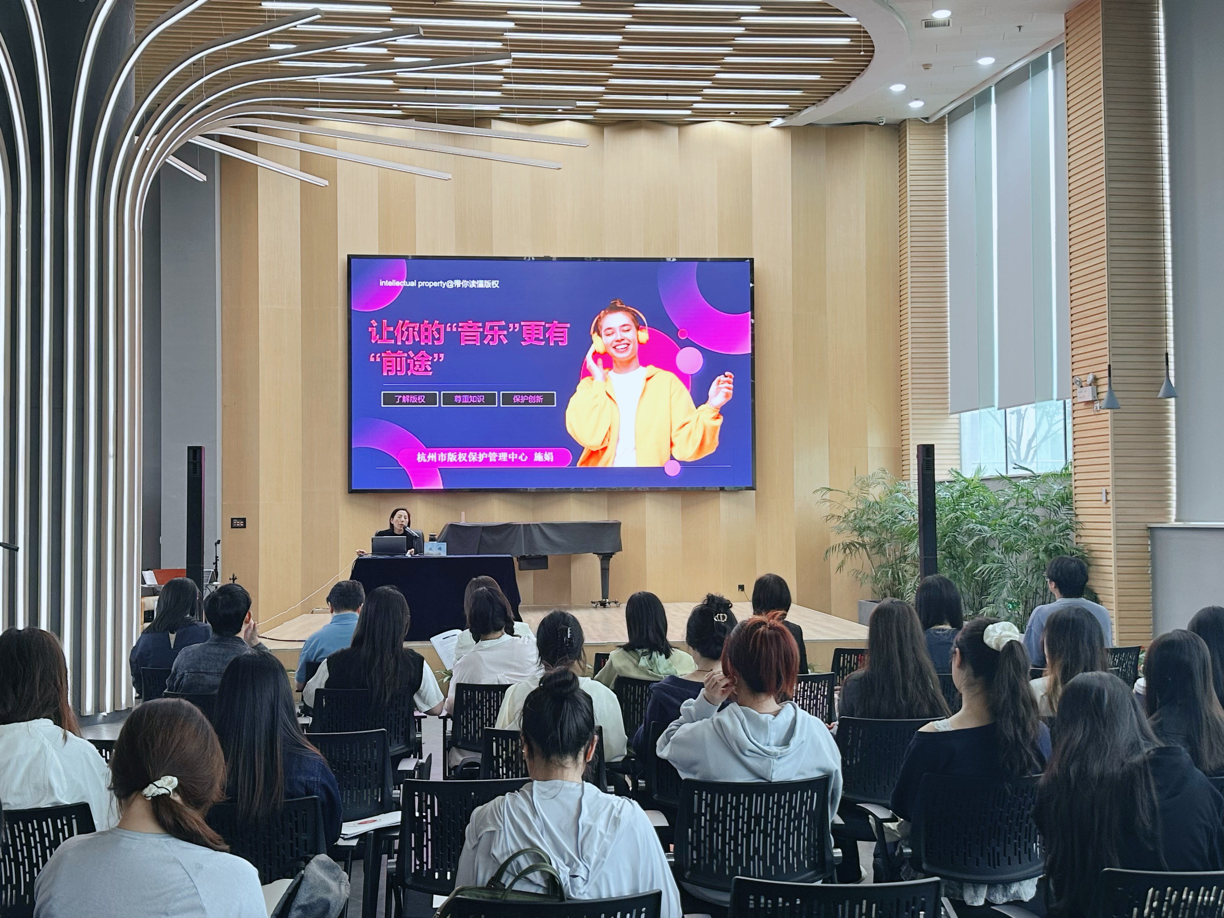 本次講座特別邀請杭州市版權(quán)保護(hù)管理中心主任、杭州市版權(quán)保護(hù)與產(chǎn)業(yè)發(fā)展促進(jìn)會會長、杭州市版權(quán)糾紛調(diào)解專業(yè)委員會副主任施娟主講。她以豐富的行業(yè)經(jīng)驗和深厚的法律功底,結(jié)合《中華人民共和國著作權(quán)法》等相關(guān)法律法規(guī),從一系列真實的音樂版權(quán)糾紛案例出發(fā),圍繞知識產(chǎn)權(quán)制度及其商業(yè)價值、知識產(chǎn)權(quán)基本概念、知識產(chǎn)權(quán)侵權(quán)風(fēng)險防范三大領(lǐng)域進(jìn)行了詳細(xì)而生動的講解。講解既豐富有趣又貼近音樂專業(yè)師生的實際,還提供了大量實用的知識產(chǎn)權(quán)保護(hù)渠道和操作指南,使得抽象復(fù)雜的法律知識變得易于理解?,F(xiàn)場氣氛熱烈,同學(xué)們積極參與互動,表現(xiàn)出極高的學(xué)習(xí)熱情。