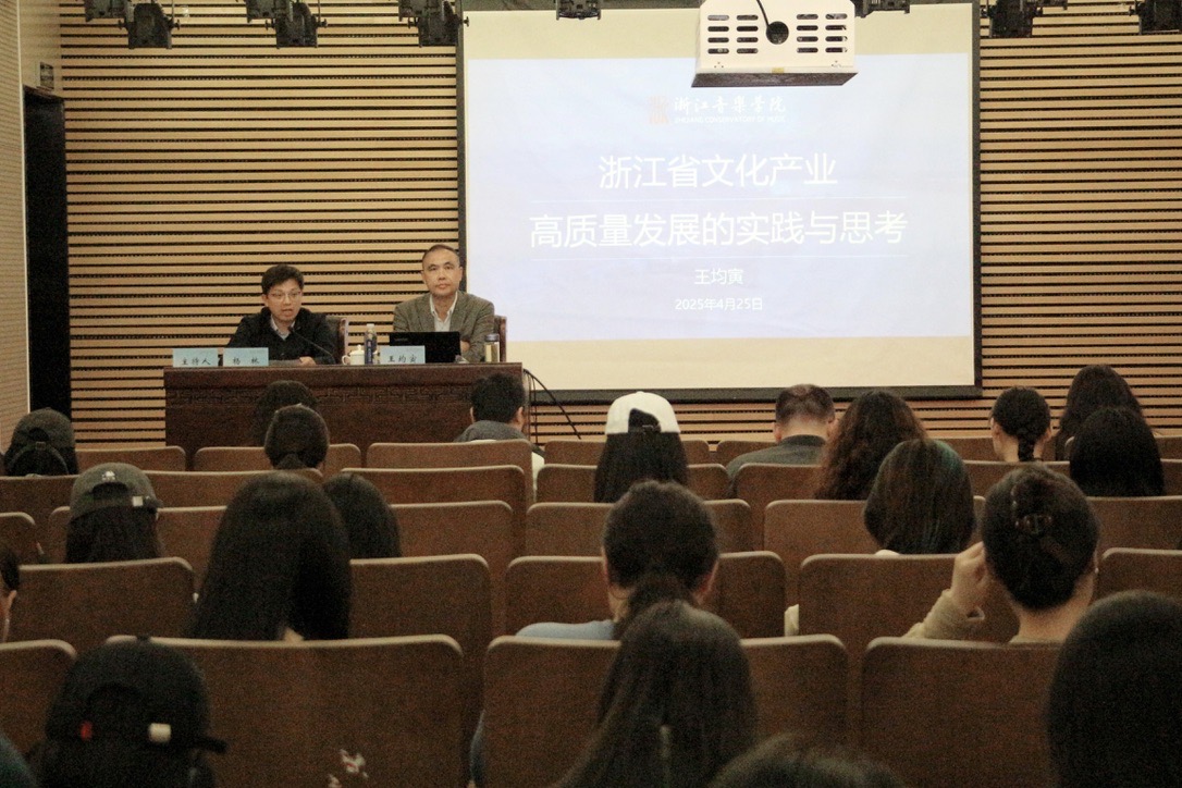 講座伊始,王均寅深入淺出地介紹了文化產(chǎn)業(yè)的定義、內(nèi)涵特征及其重要地位。他指出,文化產(chǎn)業(yè)不僅能夠提升國(guó)家的綜合競(jìng)爭(zhēng)力,更是國(guó)民經(jīng)濟(jì)的重要增長(zhǎng)點(diǎn),也為社會(huì)提供了豐富的精神食糧,有助于滿(mǎn)足人民日益增長(zhǎng)的精神文化需求。他結(jié)合詳實(shí)數(shù)據(jù),深入分析了浙江文化產(chǎn)業(yè)的發(fā)展現(xiàn)狀,以及在文化產(chǎn)業(yè)領(lǐng)域的創(chuàng)新實(shí)踐。與此同時(shí),王均寅也深刻分析了浙江文化產(chǎn)業(yè)面臨的挑戰(zhàn)和機(jī)遇,特別是良好的政策環(huán)境、深厚的文化底蘊(yùn)和強(qiáng)大的市場(chǎng)需求,都為音樂(lè)院校學(xué)生帶來(lái)前所未有的機(jī)遇。他希望同學(xué)們認(rèn)真思考自己在全省文化旅游產(chǎn)業(yè)的發(fā)展大潮中的位置,并建議大家關(guān)注文化產(chǎn)業(yè)的發(fā)展趨勢(shì),提升自身的科技素養(yǎng)和創(chuàng)新能力,積極探索音樂(lè)與科技、旅游、教育等領(lǐng)域的跨界融合,為文化產(chǎn)業(yè)的發(fā)展貢獻(xiàn)自己的力量。他還與同學(xué)們展開(kāi)互動(dòng)討論交流,現(xiàn)場(chǎng)氣氛熱烈。