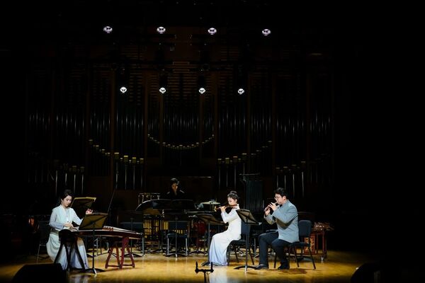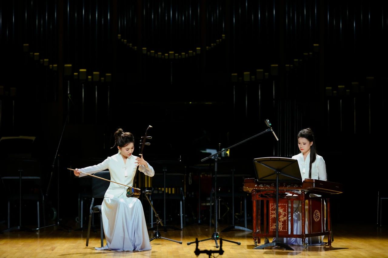 隨后,由樂團青年二胡演奏家裴文鈺與國樂系學生尤煊潁演繹了譚盾的二重奏作品《雙闕》。作曲家將古樸的樂思與現(xiàn)代作曲技法相結(jié)合,使得樂曲在弓弦與琴竹的互動中展現(xiàn)出新的活力,凸顯了其對傳統(tǒng)演奏模式的突破性思考。