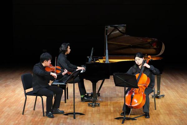 最后,貝多芬《降E大調(diào)第一鋼琴三重奏》(Op.1 No.1)第一樂章,在小提琴王圣涵、大提琴吳語瞳與鋼琴孫秉鈺(指導(dǎo)教師:史佳怡)三位學(xué)員的默契配合下,將古典形式的均衡美感與初現(xiàn)的浪漫情感細(xì)膩交織,引人入勝。