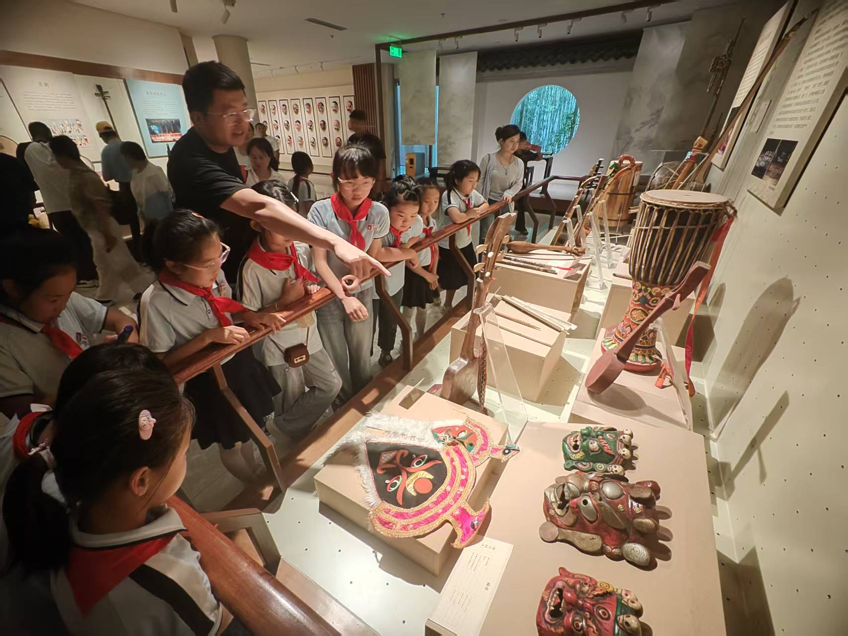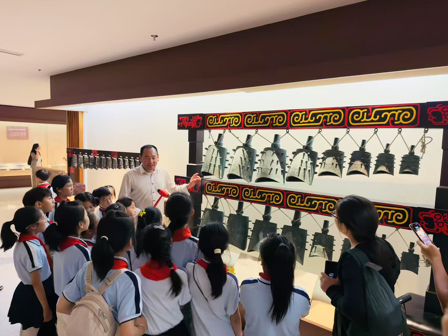 在浙音之窗,孩子們?cè)诖髮W(xué)生志愿者的講解下,詳細(xì)了解了學(xué)院的建設(shè)發(fā)展歷程、學(xué)科專業(yè)設(shè)置和辦學(xué)特色亮點(diǎn)等;而音樂(lè)博物館之旅更讓孩子們眼界大開(kāi),古今中外各色樂(lè)器,仿佛為他們打開(kāi)了新世界的大門(mén)——在學(xué)院文化特派員馮宇光的講解下,大家不僅了解了各種樂(lè)器的特點(diǎn),更感受到中國(guó)傳統(tǒng)文化的獨(dú)特魅力。孩子們還敲響了典雅莊重的戰(zhàn)國(guó)編鐘,觸摸華麗精美的紋飾、聆聽(tīng)穿越歷史的聲音,不由贊嘆古人的智慧,感受到中華音樂(lè)文化的博大精深。