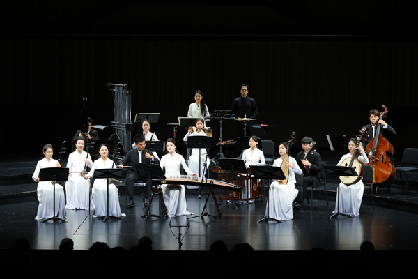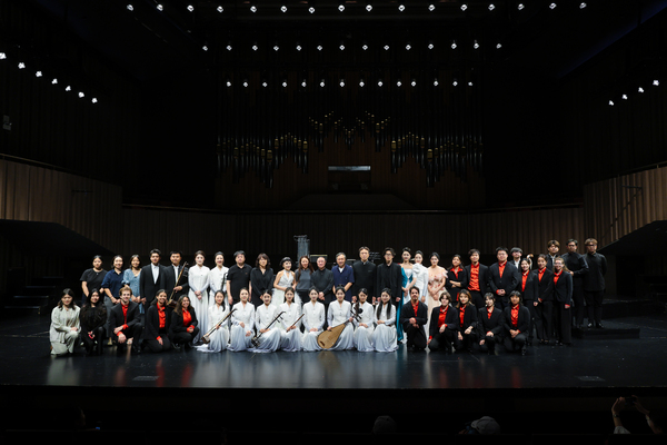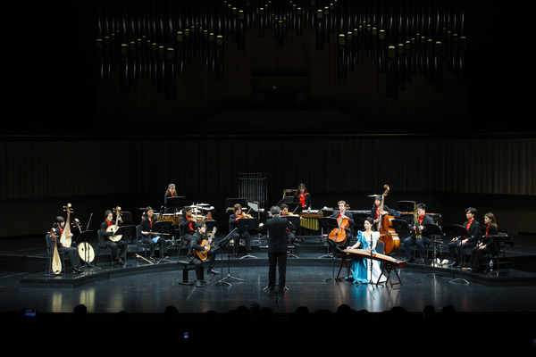 隨后,浙音民族室內(nèi)樂團帶來的4部作品,奏響了中國音樂在當代的傳承與創(chuàng)新之聲。四重奏作品《染》由樂團青年演奏家黃琳、裴文鈺、陳銘楠、張晶潔共同演繹,通過強烈的情緒色彩表達,以創(chuàng)新性的現(xiàn)代語匯展現(xiàn)了民族室內(nèi)樂的大膽探索;《詩語江南》由樂團青年古箏演奏家樓琳與樂團共同演奏,以浙江音樂為主題,借流淌的箏韻詮釋了浙韻之美,勾勒出煙雨江南的溫婉詩意與靈動氣韻;作品《寒山》沿襲了勛伯格無調(diào)性及音色結(jié)構(gòu)的創(chuàng)作理念和手法,借悠遠空靈的“鐘鳴”,營造出“寒山聞鐘”的清冷意象與極具東方韻味的音樂意境;嗩吶與樂隊作品《太陽出來喜洋洋》則用熱烈歡騰的嗩吶傳遞出民間最質(zhì)樸的喜悅之情,將現(xiàn)場氣氛推向高潮。