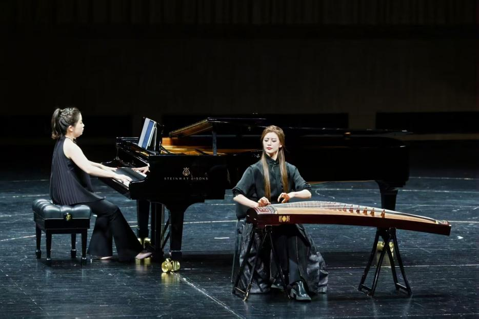 進入20世紀(jì),中國音樂家們以開放的姿態(tài)擁抱世界,將傳統(tǒng)音樂元素與西方作曲技法巧妙融合。在音樂會的第四部分,藝術(shù)指導(dǎo)教學(xué)部的教師們攜手民樂演奏家,展現(xiàn)了中西音樂對話的無限可能。楊夢漪與國樂系21級本科生王閆萱伊(導(dǎo)師:白洋)合作的《定風(fēng)波》,鋼琴的演奏沉穩(wěn)而富有張力,與古箏的靈動相得益彰,讓觀眾仿佛置身于水墨丹青的意境之中。鋼琴以十二平均律為基底,用印象派和聲模擬山水意境,古箏的微分音游走其間,鋼琴與民族樂器碰撞出奇異美感,既保留了傳統(tǒng)箏樂的韻味,又賦予作品現(xiàn)代的音響層次。