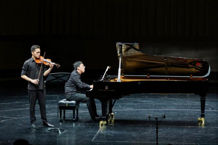 從貝多芬的激情到圣桑的優(yōu)雅,音樂會的第二部分展現(xiàn)了鋼琴在古典與浪漫主義時期室內(nèi)樂中的豐富表現(xiàn)力。藝術(shù)指導(dǎo)教學(xué)部教師劉澤圻、高晨醒、齊笑怡分別與小提琴、大提琴和雙簧管合作,呈現(xiàn)了3種截然不同的音樂性格。劉澤圻與管弦系23級本科生黃俊綱(導(dǎo)師:范晨君)帶來的貝多芬《c小調(diào)第七鋼琴與小提琴奏鳴曲》以雷霆般的力度對比展現(xiàn)鋼琴的交響化思維;高晨醒與附中趙憶南同學(xué)(導(dǎo)師:呂冰夏)帶來的貝多芬《A大調(diào)第三大提琴奏鳴曲》如詩如歌,鋼琴的流動琶音與大提琴的吟唱交織出綿長的抒情線條;齊笑怡與管弦系23級本科生陳圣垚(導(dǎo)師:李佳胤)合作的圣?!禗大調(diào)雙簧管奏鳴曲》則以靈動的節(jié)奏和明亮的音色,勾勒出法國音樂的精致輪廓。