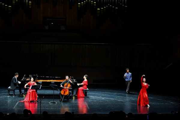 隨后,呂爍、嚴(yán)雋文與特邀大提琴演奏家陳墨、二胡張鐘云共同呈現(xiàn)《相擁》。作曲與指揮系王云飛教授創(chuàng)作的這部作品以雙鋼琴的宏大織體為框架,大提琴的深沉與二胡的婉轉(zhuǎn)交織,既有西方室內(nèi)樂的嚴(yán)謹(jǐn)結(jié)構(gòu),又飽含中國音樂的線性美感。舞蹈學(xué)院鐘楨老師編舞并帶領(lǐng)舞者們以肢體語言呼應(yīng)音樂,使整部作品成為一場跨越聽覺與視覺的藝術(shù)實驗。