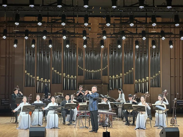 趙琦再度登臺(tái),獨(dú)奏俞遜發(fā)的遺作《瑯琊神韻》,擊音與哨笛雙音等技法的運(yùn)用,將瑯琊山的玄妙之境展現(xiàn)得淋漓盡致。終曲《幽蘭逢春》由樂(lè)團(tuán)全體奏響,作品以昆曲音樂(lè)為創(chuàng)作素材,在保留傳統(tǒng)戲曲韻味的同時(shí),通過(guò)現(xiàn)代編配手法賦予其新的藝術(shù)生命。這首充滿詩(shī)意的終曲,為整場(chǎng)音樂(lè)會(huì)畫(huà)上了意蘊(yùn)深遠(yuǎn)的句點(diǎn)。