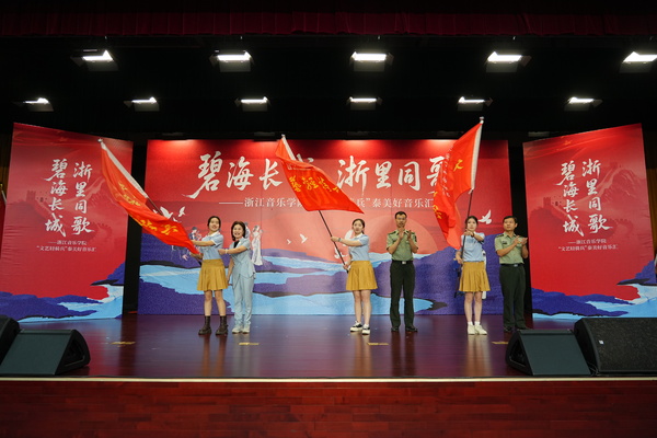 軍地領(lǐng)導、泰隆慈善基金會相關(guān)負責人共同為浙音“文藝輕騎兵”授旗。