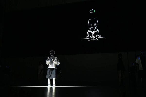 整場(chǎng)演出如一部微型電影,以四個(gè)篇章展開機(jī)器人從“職場(chǎng)化身”到“生活個(gè)體”的蛻變。序幕,機(jī)器人與演員身著同款制服,身份瞬間交融,隱喻機(jī)器人即是為生活奔波的人類。日間職場(chǎng),機(jī)器人陣列精準(zhǔn)群舞,再現(xiàn)高強(qiáng)度工作節(jié)奏,“電量消耗”的視覺(jué)化呈現(xiàn),極具沖擊;夜幕之下,它們擠“地鐵”、顯“疲憊”;直到返家、掙脫工牌,在下棋等生活場(chǎng)景中,“小確幸”通過(guò)聲光巧妙轉(zhuǎn)化為“充電”過(guò)程,深刻點(diǎn)題——“生活,才是終極充電器”。然后在又一個(gè)清晨,它們“滿電”歸來(lái),重啟平凡日常。