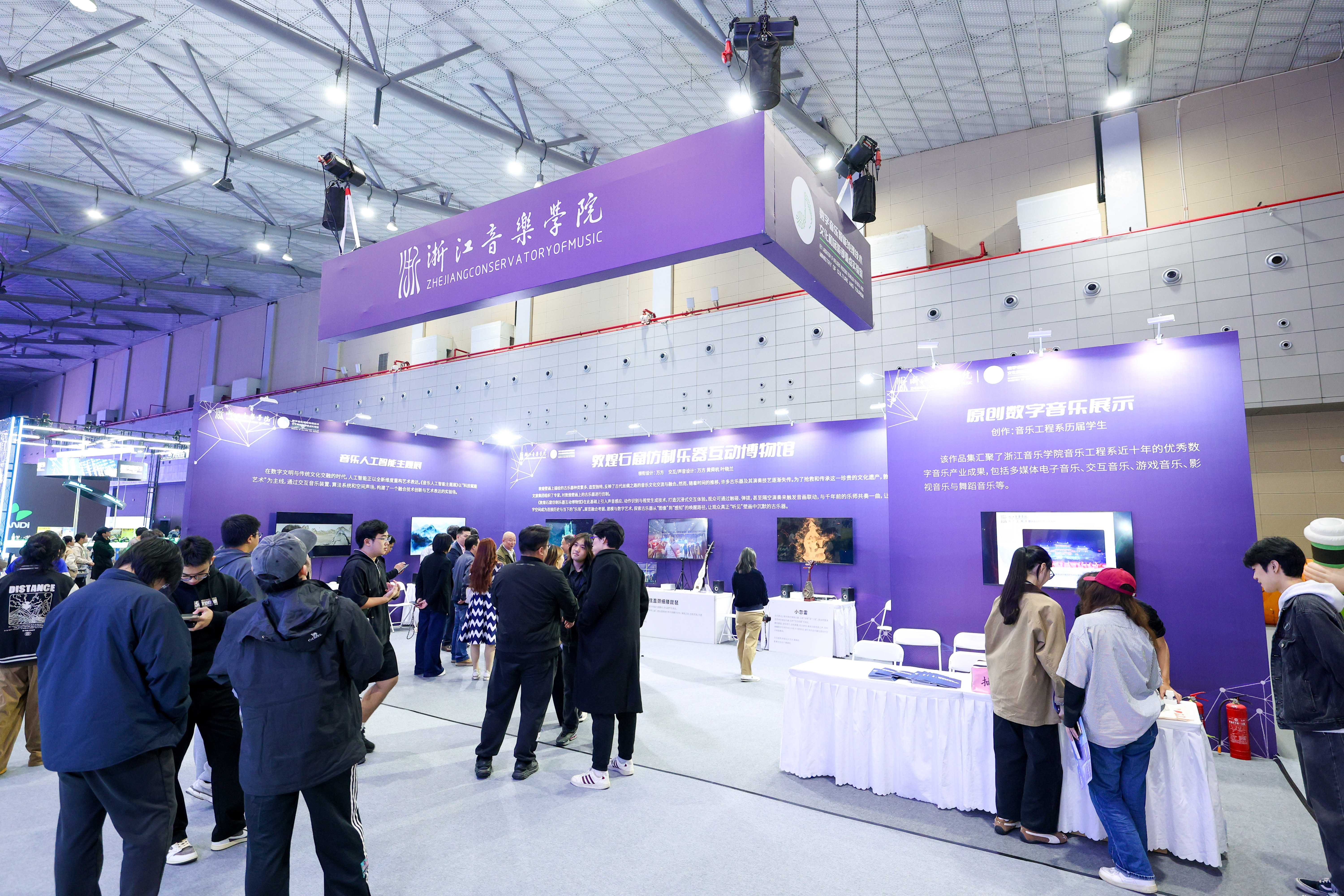 音博會(huì)期間,學(xué)院組織數(shù)字音樂智能處理技術(shù)文化和旅游部重點(diǎn)實(shí)驗(yàn)室、音樂工程系,共同呈現(xiàn)“敦煌石窟仿制樂器互動(dòng)博物館”“音樂人工智能主題展”“原創(chuàng)數(shù)字音樂展”與“沉浸聲實(shí)時(shí)交互系統(tǒng)”等主題展區(qū),其中“敦煌石窟仿制樂器互動(dòng)博物館”精心復(fù)原了壁畫古樂器,引入聲音感應(yīng)、動(dòng)作識(shí)別與視覺生成技術(shù),音畫聯(lián)動(dòng),讓數(shù)字空間成為連接歷史與當(dāng)下的“樂場(chǎng)”;“沉浸聲實(shí)時(shí)交互系統(tǒng)”通過靈活定制音響布局、數(shù)量、聲音空間軌跡及實(shí)時(shí)音頻可視化效果,搭配特定的聲音空間定位算法,構(gòu)建起一套涵蓋軟硬件工程、內(nèi)容創(chuàng)意與制作的沉浸聲實(shí)時(shí)交互解決方案;“音樂人工智能主題展”則通過交互音樂裝置、算法系統(tǒng)和空間聲場(chǎng),構(gòu)建融合技術(shù)創(chuàng)新與藝術(shù)表達(dá)的實(shí)驗(yàn)場(chǎng)。通過豐富的互動(dòng)體驗(yàn)與前沿的科技融合,成為本屆音博會(huì)備受關(guān)注的亮點(diǎn)之一,充分展現(xiàn)學(xué)院在音樂科技與產(chǎn)業(yè)融合方面的探索成果。