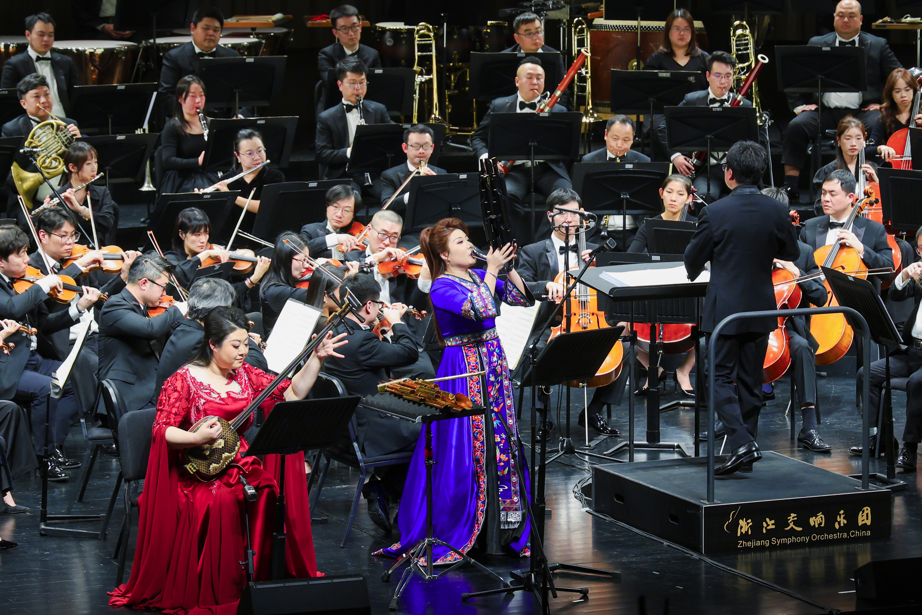 本次首演以中國(guó)傳統(tǒng)民歌為母題,通過(guò)“雙獨(dú)奏+大型交響樂(lè)團(tuán)”這一獨(dú)特結(jié)構(gòu),依次演出了《沂蒙山》《飛歌》《繡荷包》《花兒》《囊瑪·鍋莊》《對(duì)鳥(niǎo)·采茶》《趕牲靈》《跳月》《牧歌》《東北風(fēng)》《漁舟唱晚》《對(duì)花》12首新作,構(gòu)建綿延敘事的民族音樂(lè)圖景,實(shí)現(xiàn)傳統(tǒng)素材在當(dāng)代舞臺(tái)上的再度升華。