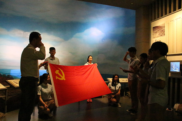 在紀(jì)念館偉人壁畫像前,學(xué)生黨員代表向著黨旗,舉起右手重溫入黨誓詞。莊嚴(yán)的畫面、豪邁的誓言使每一位黨員仿佛回到了入黨的那一刻,又一次接受心靈的洗禮,進(jìn)一步堅(jiān)定了立場(chǎng)信念。