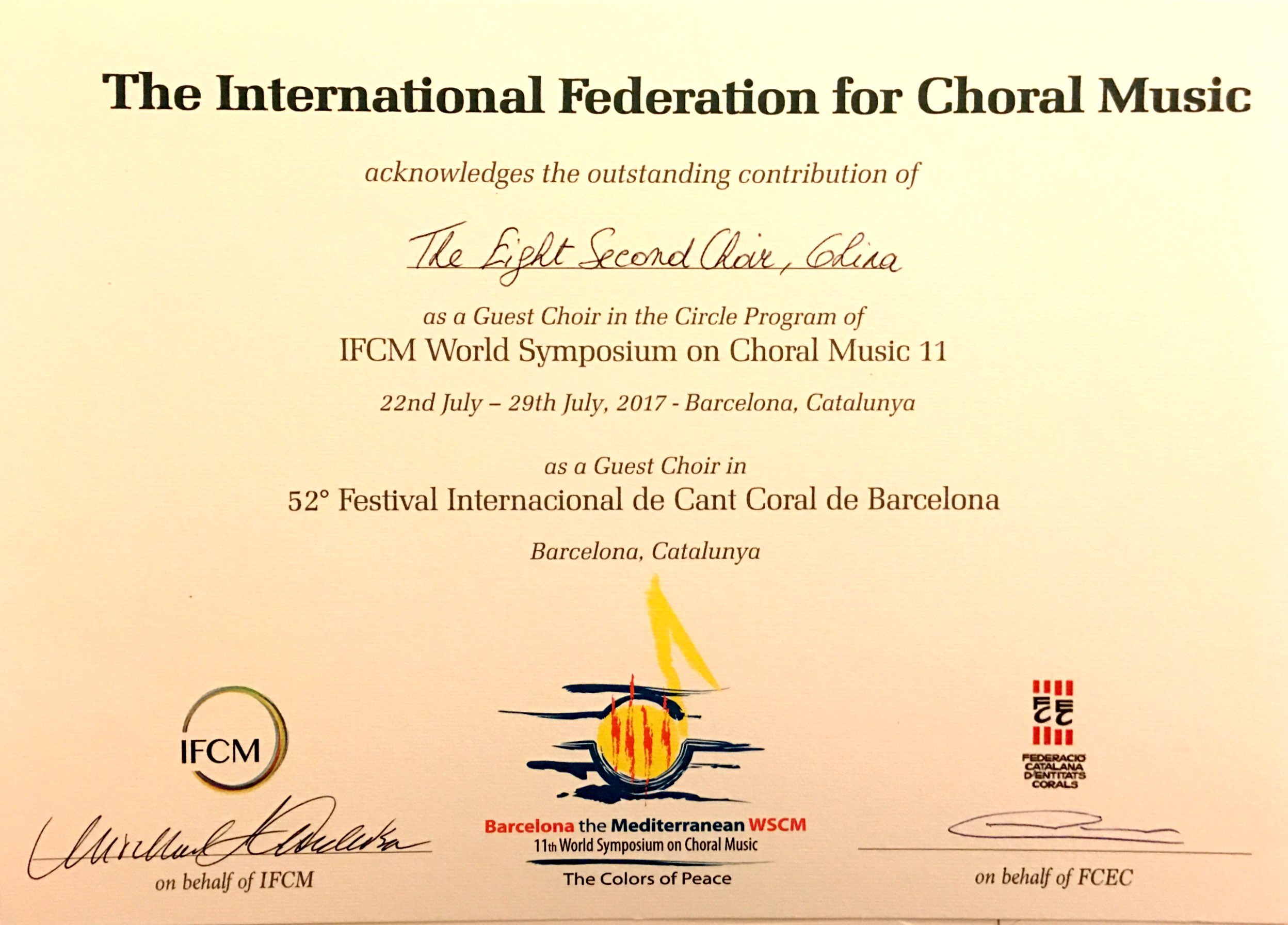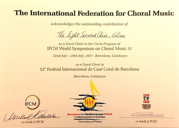 7月22日至29日,第十一屆世界合唱研討會(huì)在風(fēng)景如畫的巴塞羅那舉行,學(xué)院“八秒”合唱團(tuán)受國(guó)際合唱聯(lián)盟(IFCM)邀請(qǐng)參加盛會(huì)。期間,“八秒”合唱團(tuán)舉辦的兩場(chǎng)合唱音樂會(huì)獲得巨大成功,在當(dāng)?shù)匾饛?qiáng)烈反響,國(guó)際合唱聯(lián)盟為“八秒”合唱團(tuán)頒發(fā)研討會(huì)參演最高榮譽(yù)——“杰出貢獻(xiàn)”榮譽(yù)證書。