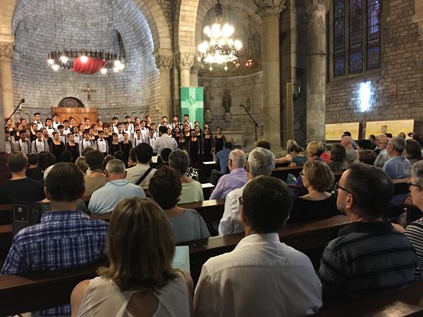 當(dāng)?shù)貢r(shí)間7月26日晚,第二場(chǎng)展演活動(dòng)在巴塞羅那最古老的教堂——圣貝雷·德·布埃亞斯教堂舉行。本場(chǎng)音樂會(huì),“八秒”合唱團(tuán)成員與同時(shí)受邀的前來展演的加拿大多倫多“VIVA”青年合唱團(tuán)同臺(tái)交流展演。在這座歷經(jīng)滄桑的古老建筑里,來自東方亮麗的青春之聲和來自西方溫雅的安寧之聲共同贏得了歡呼和贊美。“八秒”合唱團(tuán)用傳統(tǒng)博大的中華文化開啟演唱會(huì)的序幕,《江雪》《游子吟》《阿細(xì)跳月》《大弄賴婁》將美麗的中國(guó)故事在此綻放,向世界展示和諧、燦爛、輝煌的中華文明。