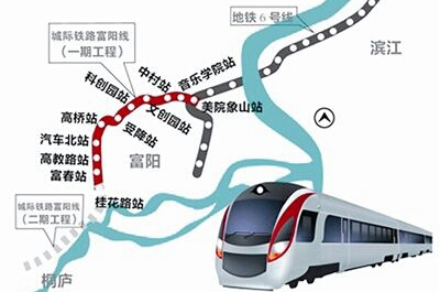 杭富城際鐵路起于之江旅游度假區(qū)的地鐵6號線美院象山站,向西經(jīng)音樂學(xué)院站、之江旅游度假區(qū)轉(zhuǎn)塘單元、富陽銀湖街道、富春街道,終于富陽主城區(qū)的桂花路站。