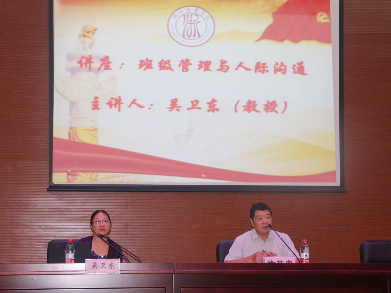 培訓會上,學院特邀浙江外國語學院教師培訓學院院長吳衛(wèi)東教授為大家作了《班級管理與人際溝通》專題講座。吳衛(wèi)東教授結(jié)合自身多年實際工作經(jīng)驗和豐富案例,著重就“從松散群體到班級集體”、“班集體的社會心理指標”、“人際溝通的技巧”及“如何贏得信任”等四個方面問題進行了具體闡述,為大家切實做好班級管理和人際溝通工作提供了行動指南,具有很強針對性和實效性。