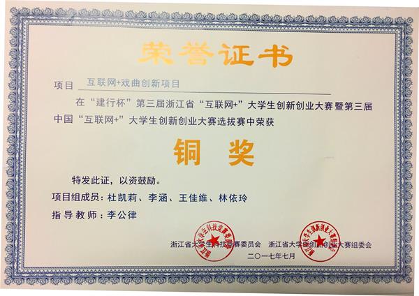 近日,第三屆浙江省“互聯(lián)網(wǎng)+”大學(xué)生創(chuàng)新創(chuàng)業(yè)大賽圓滿落下帷幕,我院戲劇系學(xué)生杜凱麗參與“互聯(lián)網(wǎng)+戲曲創(chuàng)新項目”摘得銅獎。