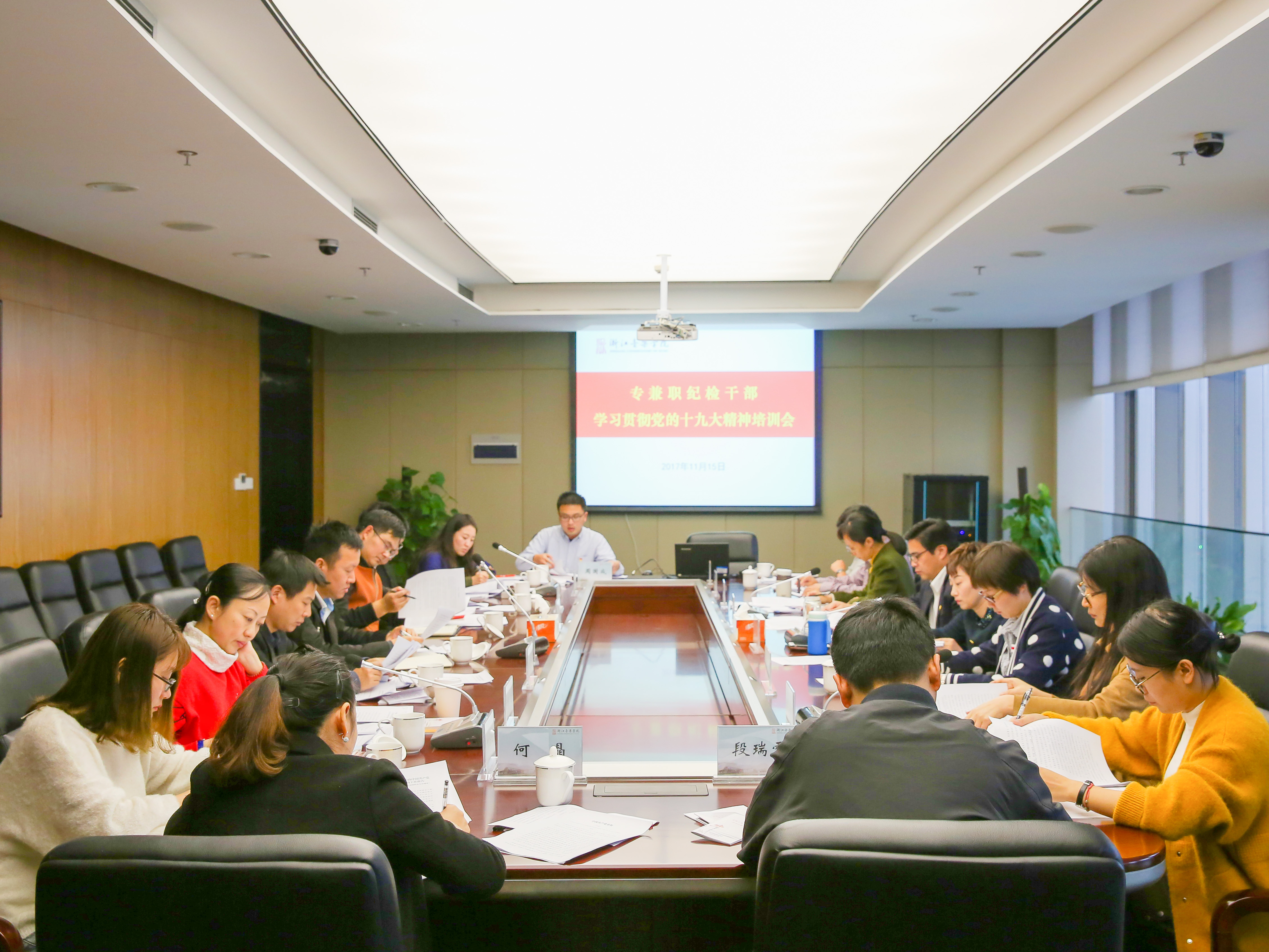 11月15日,學院紀委召開學習貫徹落實黨的十九大精神專題培訓會,黨委委員、紀委書記方培新,全體專職紀檢干部、各二級黨組織紀檢委員參加。