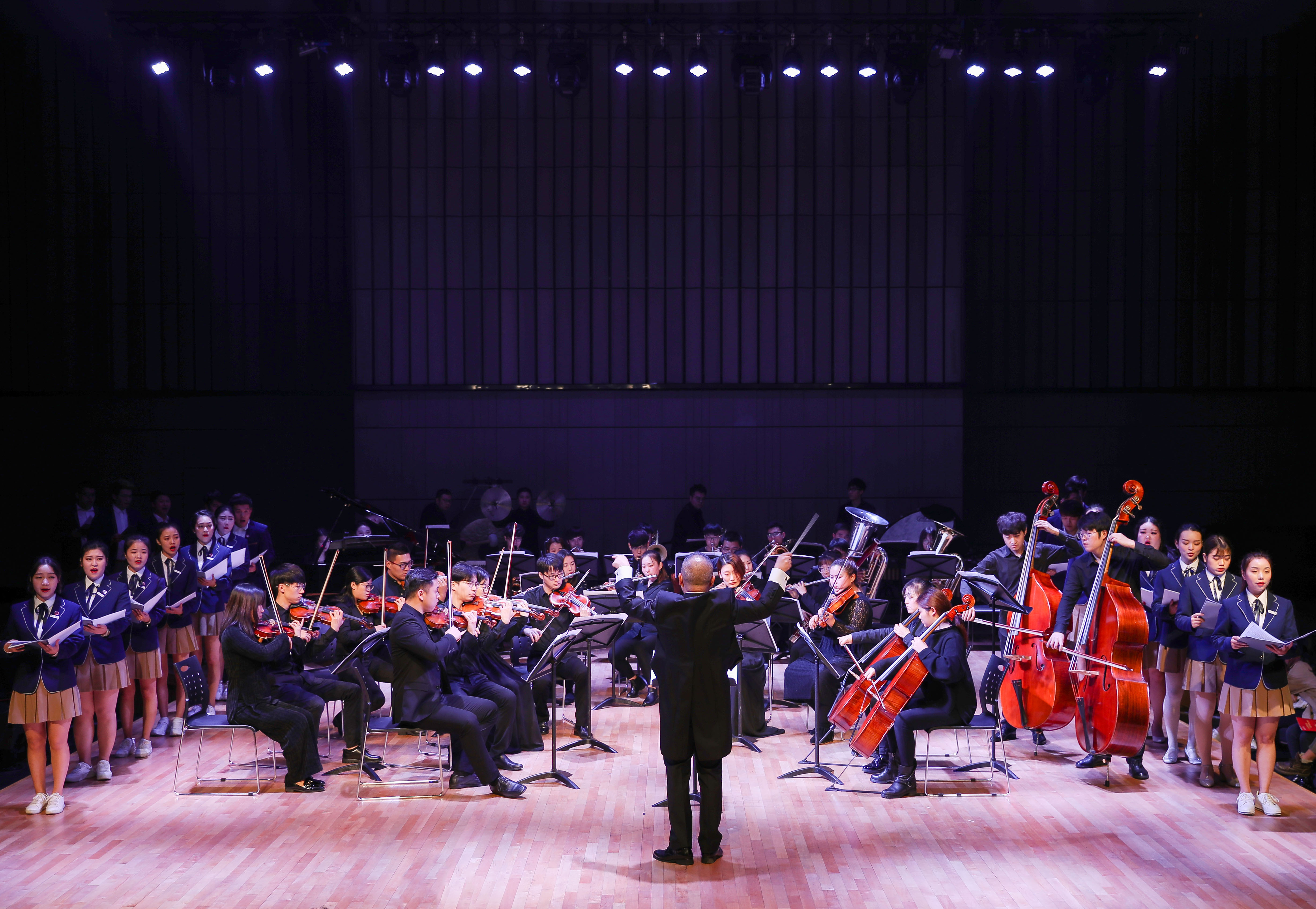 實(shí)習(xí)管弦樂團(tuán)演奏的小提琴協(xié)奏曲《梁?!?,采用交響樂與民間戲曲音樂的表現(xiàn)手法,深入而細(xì)膩地描繪了梁祝相愛、抗婚、化蝶的情感與意境,演出由劉梓毅小提琴領(lǐng)銜獨(dú)奏,利用小提琴、長笛、單簧管等樂器演奏出一曲現(xiàn)代民族化協(xié)奏曲?!短柍鰜硐惭笱蟆酚勺髑c指揮系學(xué)生王翻進(jìn)行改編,實(shí)習(xí)樂團(tuán)管弦樂隊(duì)進(jìn)行演奏,旋律悅耳動聽,表現(xiàn)出音樂較高的抒情性和藝術(shù)性。聲樂歌劇系沈鑫輝同學(xué)用歡快響亮的聲音演繹了流行歌曲《金銀島》,歌曲以聲傳情、以情繪聲,激情澎湃的歌聲感染了聽眾?!侗Pl(wèi)黃河》由鋼琴系呂周容、張婧婧同學(xué)合奏,他們用華麗的技巧和飽滿的激情激勵著人民在未來的人生道路上拼搏奮進(jìn)。男女生二重唱《老師我想你》由聲樂歌劇系的張杰和黃楊鑫進(jìn)行演唱,熱情動聽的演唱,訴說了對老師的崇敬與感激之情。《千與千尋》音樂與朗誦是整臺演出中最具詩意的節(jié)目,伴隨著深情、悠揚(yáng)的旋律,何昱良同學(xué)表達(dá)出所有畢業(yè)生對母校的熱愛、對老師的不舍以及對未來新征程的信心。在14級實(shí)習(xí)樂團(tuán)昊辰老師的指揮下,合唱隊(duì)用溫柔的歌聲詮釋了《我期待》這首歌曲?!恫继m詩歌》由作曲與指揮系瞿璐進(jìn)行改編,實(shí)習(xí)樂團(tuán)合唱隊(duì)進(jìn)行演唱,管弦樂隊(duì)進(jìn)行演奏,人聲與樂隊(duì)的結(jié)合,聲音扎實(shí)而震撼,如同蓄謀已久的內(nèi)在力量突然迸發(fā),情緒高漲,震撼人心?!拔逍羌t旗迎風(fēng)飄揚(yáng) ,勝利歌聲多么響亮……”演出的壓軸作品是被譽(yù)為“第二國歌”的《歌唱祖國》,在令人心潮澎湃的集體大合唱中2014級畢業(yè)生實(shí)習(xí)樂團(tuán)用雄偉嘹亮的歌聲和飽滿的熱情向大家展示了浙音學(xué)子的專業(yè)技能和當(dāng)代大學(xué)生積極向上的精神風(fēng)貌。