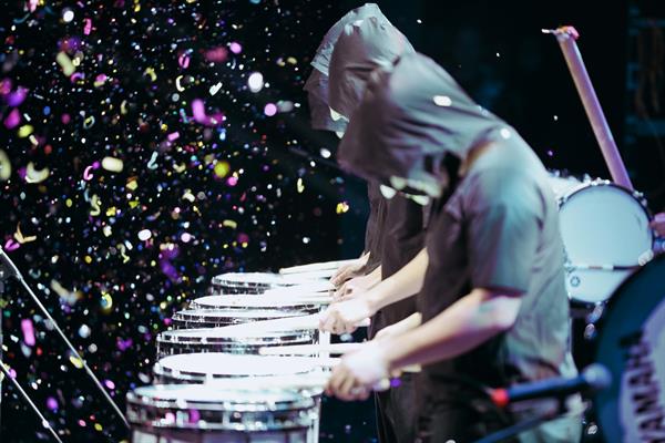 音樂(lè)會(huì)在一首打擊樂(lè)曲《Crazy fox》拉開(kāi)帷幕,將現(xiàn)場(chǎng)一千多位觀眾帶入流行音樂(lè)的殿堂。每一下鼓棒的敲擊都錚錚有力,帶有肆意揮灑青春的味道。隨著舞臺(tái)燈光的黑暗顯現(xiàn)出帶夜光的鼓棒和鼓手的面具,鼓手們?cè)诤诎抵蟹路鹦挠徐`犀般互相敲打著鼓,觀眾們的掌聲和歡呼聲見(jiàn)證著音樂(lè)會(huì)的盛況空前。