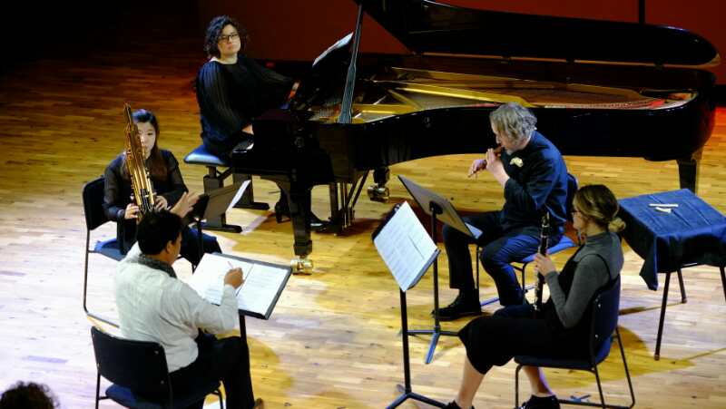 音樂會下半場更注重于中新兩國音樂家與音樂文化的碰撞與交融。于海英演奏了由新西蘭音樂學(xué)院作曲學(xué)生喬所作的《揚琴小品—音箱》(Sound Box)。新西蘭音樂學(xué)院管弦系學(xué)生尼克(Nick)和李恩·夫里依(Liam Furey)演奏了浙江音樂學(xué)院作曲與指揮系學(xué)生王志浩的小提琴與鋼琴《幻想曲》。新西蘭音樂家李·托馬斯(Leah Thomas)、尕布里厄娜(Gabriena)、阿利斯塔爾(Alistair)與申玉晶老師一起,共同演奏了浙江音樂學(xué)院作曲與指揮系學(xué)生米怡綿為小提琴、低音黑管、鋼琴和毛利樂器(Taonga Puoro)而作的《閃米和薩滿》。 新西蘭鋼琴家尕布里厄娜(Gabriena)與申玉晶聯(lián)袂演奏了我院作曲與指揮系沈納藺教授為此行由鋼琴曲改作的鋼琴與笙二重奏《西湖花鬧》,此曲充滿了對西湖花鬧的贊美和感懷。中西音樂理念在此次合作中不斷碰撞與交融,中西樂器的和鳴為各自的音樂作品增添了跨文化的魅力。中國——新西蘭新一代音樂家在相互交流中煥發(fā)出新的生機與活力。
