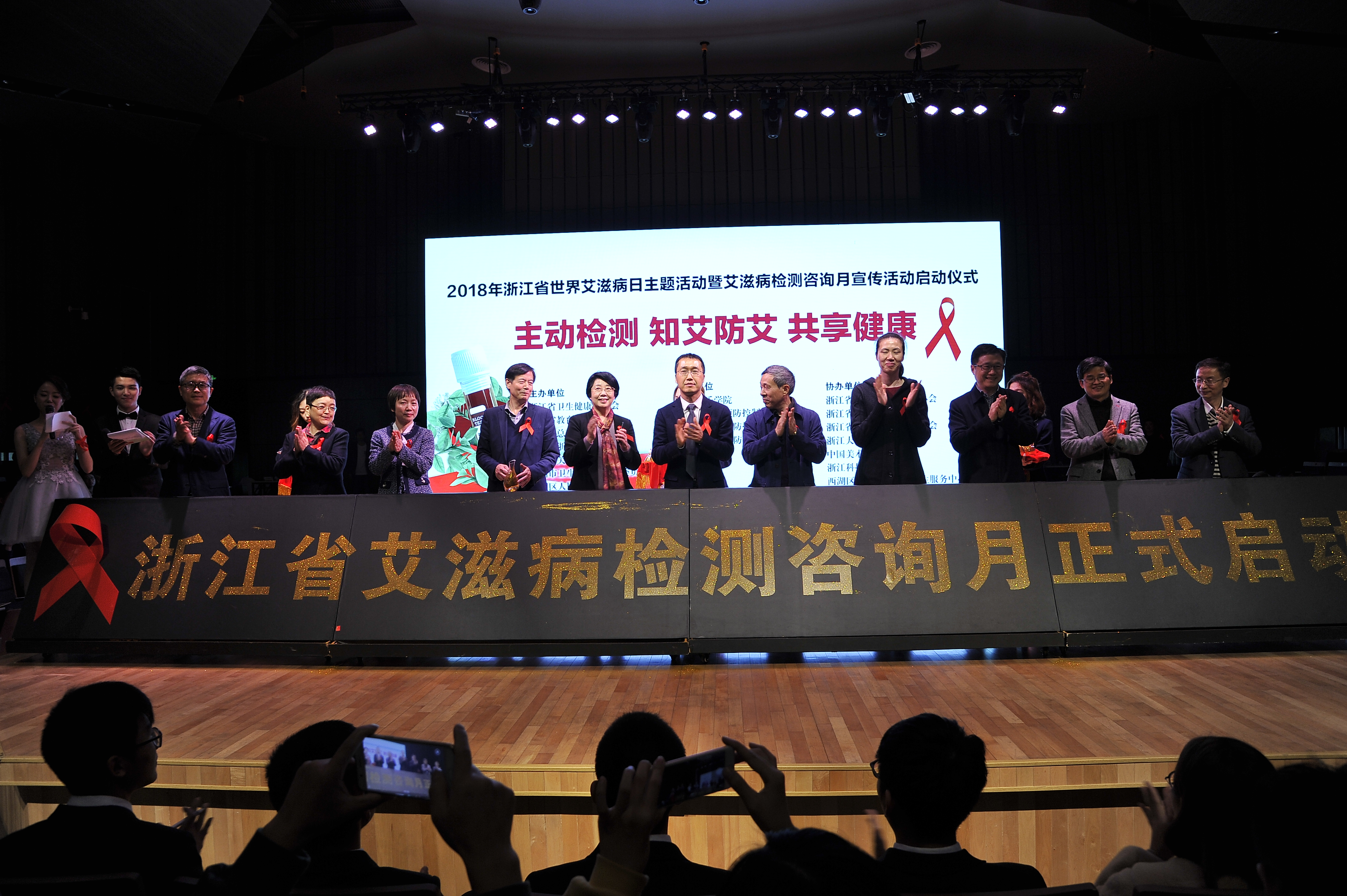 11月27日下午,2018年浙江省世界艾滋病日主題活動暨艾滋病檢測咨詢月宣傳活動啟動儀式在我院舉辦。浙江省衛(wèi)生健康委副主任曹啟峰,浙江省教育廳副廳長丁天樂,浙江省總工會副主席張衛(wèi)華,共青團浙江省委副書記周蘇紅,杭州海關(guān)副關(guān)長陳孟裕,我院黨委副書記賈秀英,西湖區(qū)人民政府副區(qū)長錢志清,浙江省疾病預防控制中心書記胡崇高,杭州市衛(wèi)生和計劃生育委員會副主任鄭冰,杭州市疾控中心黨委書記趙剛,西湖區(qū)衛(wèi)計局黨委書記、局長朱文,以及浙江大學、中國美術(shù)學院、浙江科技學院等高校近300余名師生參加。