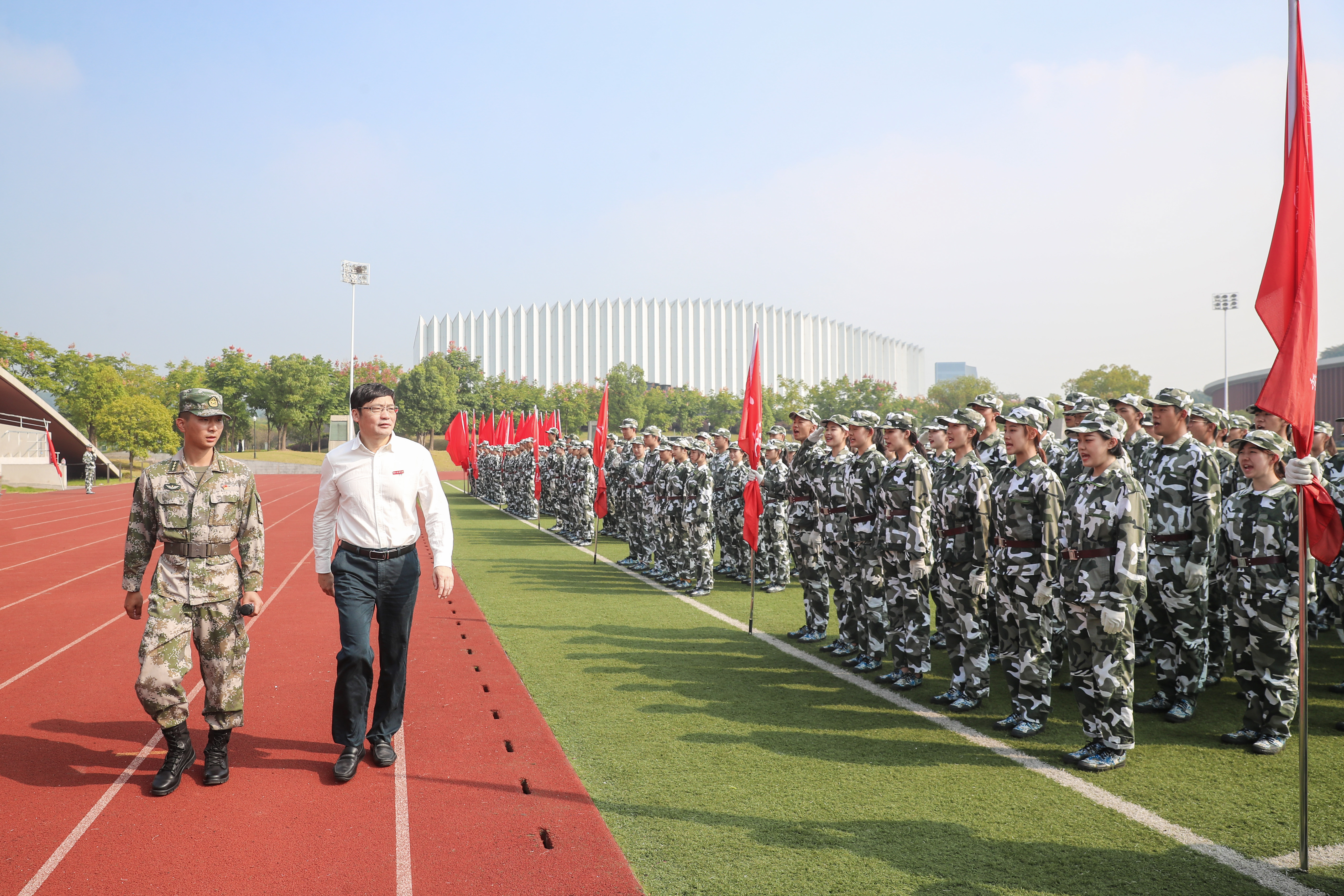 胡建新在吳龍的陪同下對2019級600余名新生進行檢閱。