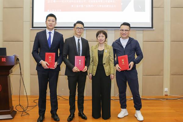 儀式上,賈秀英為陳偉星、鄭偉龍、白云峰等3位知名企業(yè)家頒發(fā)浙江音樂學院精英班創(chuàng)業(yè)導師聘書。
