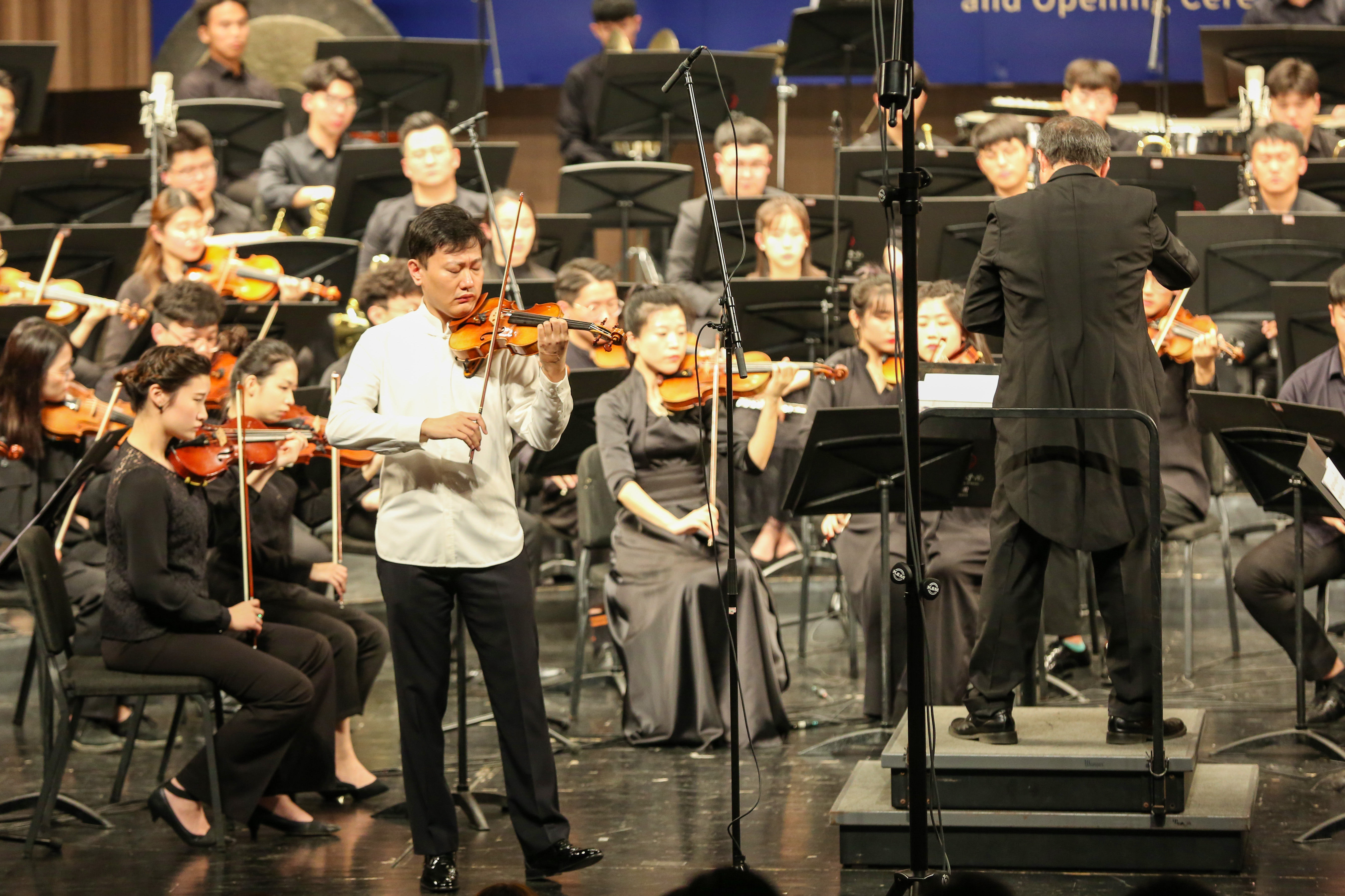 當(dāng)晚,學(xué)院還在音樂廳舉行了“紅旗頌”中國經(jīng)典交響樂作品音樂會暨第二屆國際室內(nèi)樂開幕式音樂會。音樂會上,學(xué)院交響樂團(tuán)攜手著名小提琴演奏家陳曦、旅美鋼琴家丁陽演奏了小提琴協(xié)奏曲《梁山伯與祝英臺》、鋼琴協(xié)奏曲《黃河》,還精彩呈現(xiàn)了《紅旗頌》《茉莉花》《瑤族舞曲》《山丹丹花開紅艷艷》等中國經(jīng)典交響作品。氣勢磅礴、優(yōu)美動聽的中國旋律響徹音樂廳上空,觀眾們在強(qiáng)烈的感官沖擊下受到了難忘的心靈洗滌。