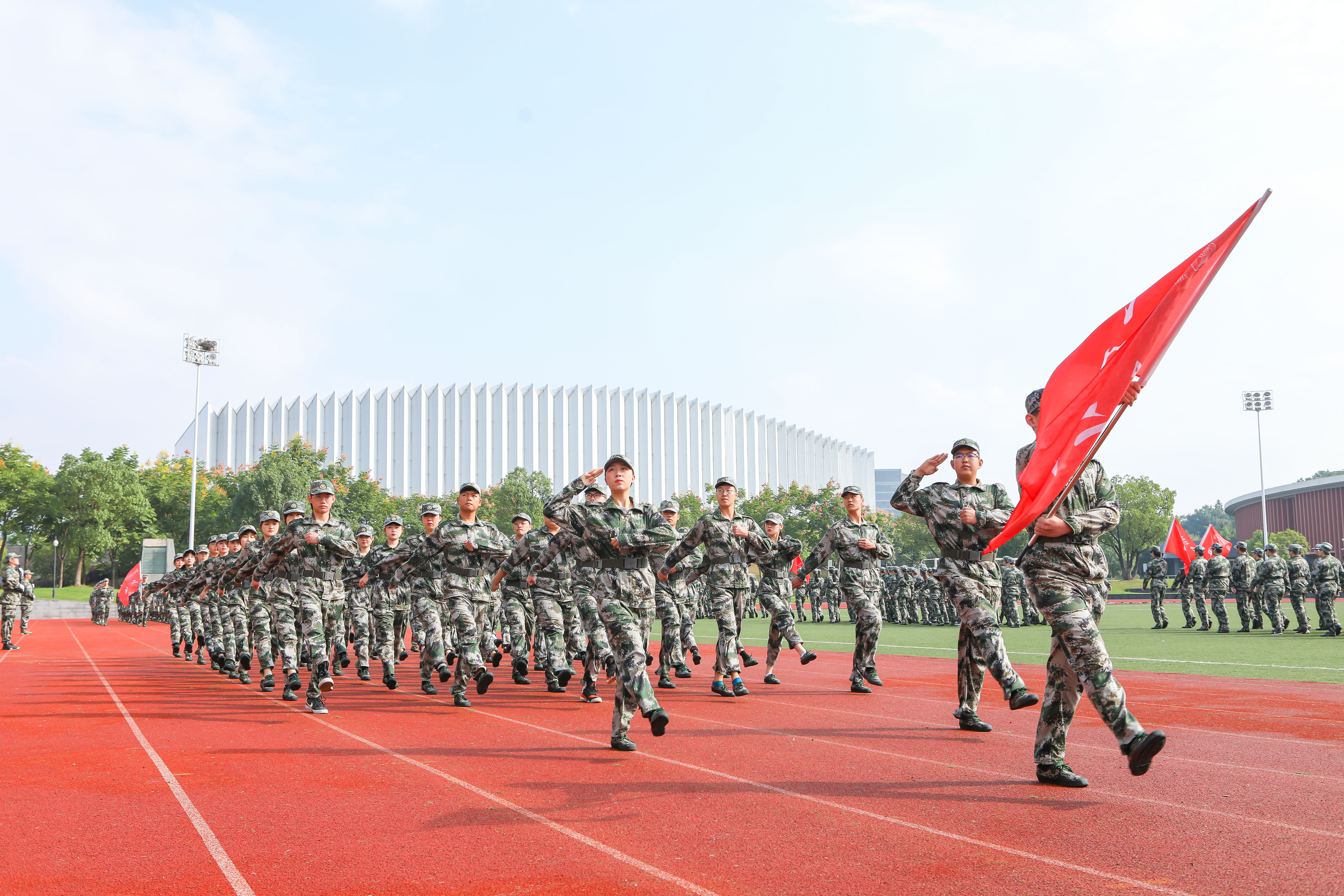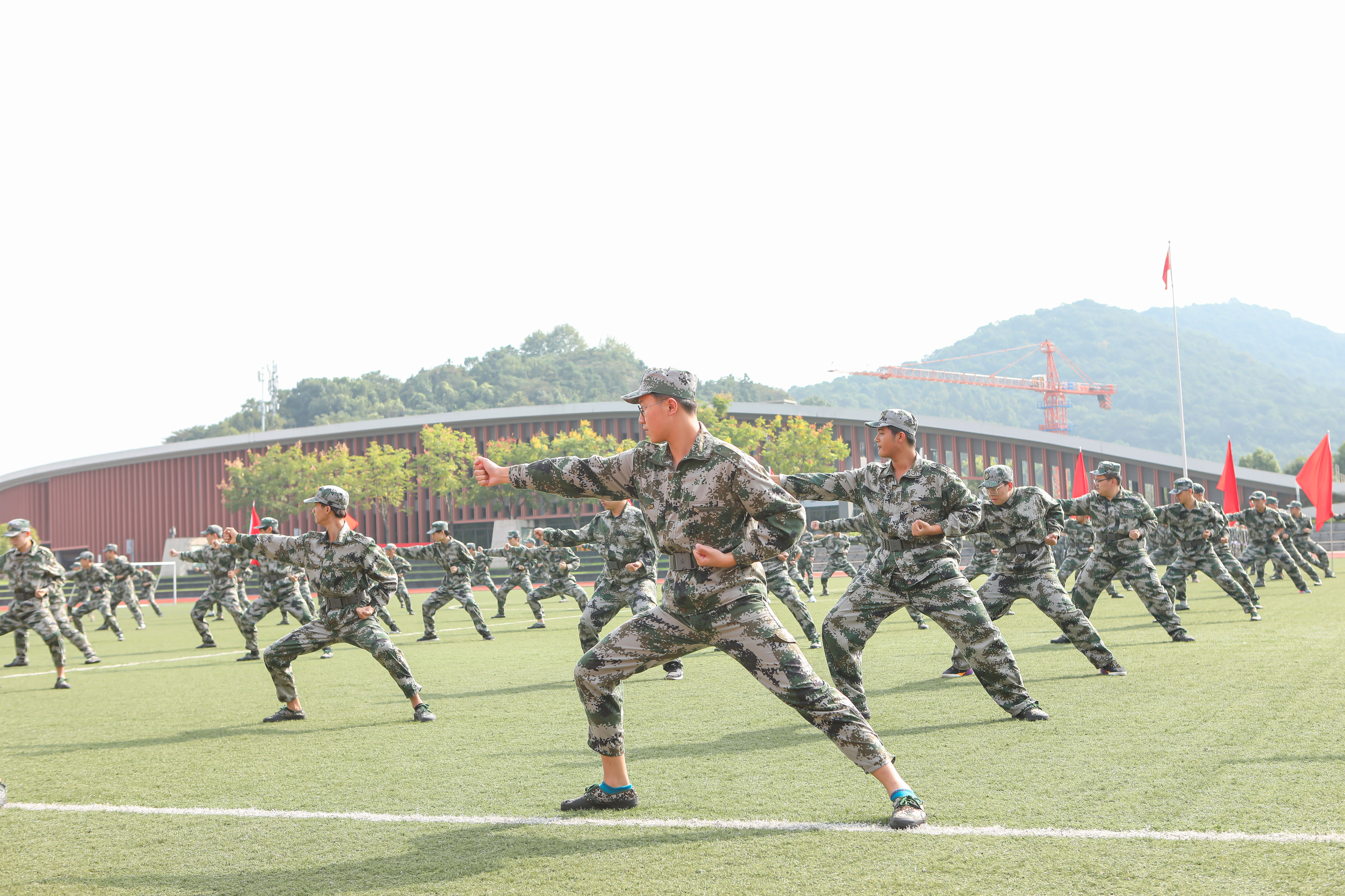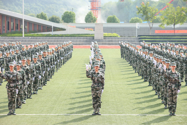 現(xiàn)場,參訓新生邁著鏗鏘有力的步伐、喊著響亮的口號進行了分列式表演。整齊的動作、堅定的目光、嘹亮的口號,展現(xiàn)出浙音新生昂揚的風貌和過硬的素質(zhì)。近200名男生進行了百人軍體拳,他們將拳打、腳踢、摔倒、奪刀等格斗動作展現(xiàn)得淋漓盡致。近400名女生組成花樣列隊操,變化展示著“I love ZJCM”字體和《志成學子之歌》的手語操,整齊化一的動作、嘹亮的番號聲,充分展現(xiàn)了年輕浙音學子們不折不撓、事必盡善的團隊精神,贏得與會領導和在場觀眾的陣陣掌聲。