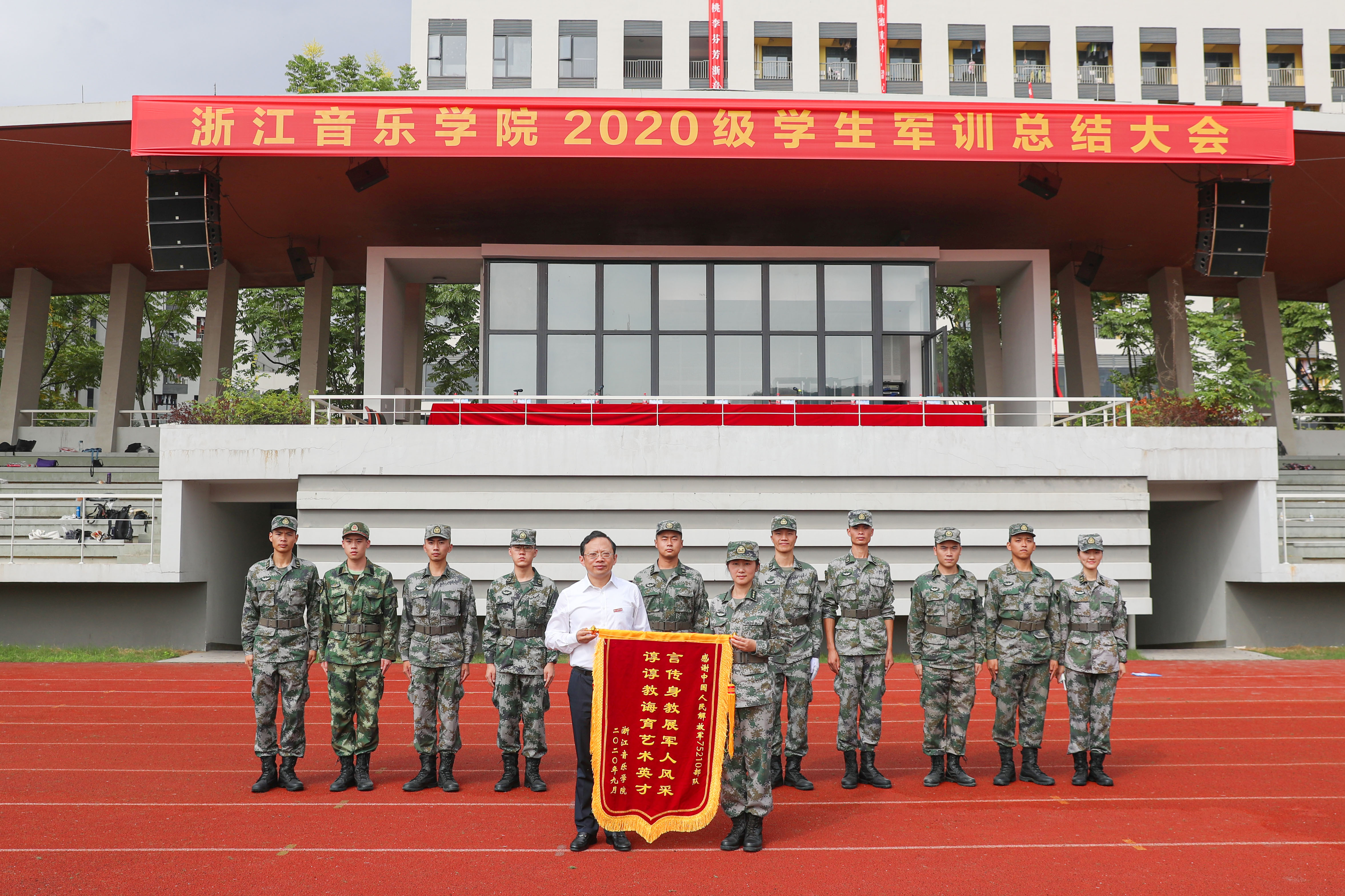 告別炎炎夏日,迎來收獲的金秋。9月24日上午,在莊嚴的國歌聲中,浙江音樂學院2020級本科生軍訓總結(jié)大會在田徑場拉開帷幕。學校黨政領導班子成員胡建新、王瑞、張建國、賈秀英、楊九華、應達偉、奚麗萍,承訓部隊營長樊彥利出席。會議由副校長楊九華主持。