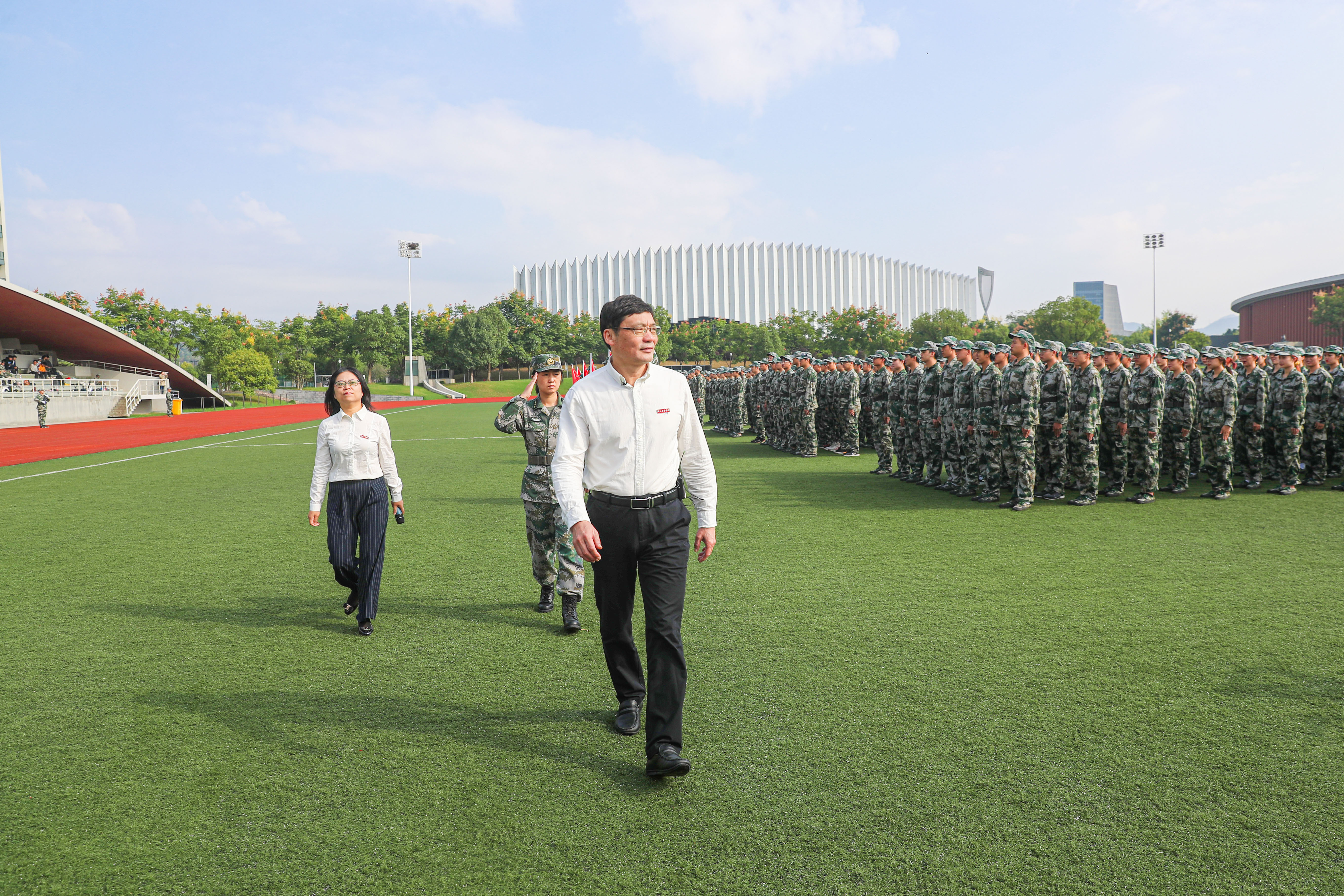 校黨委書記胡建新在軍訓營有關(guān)負責人的陪同下檢閱軍訓列隊方陣。