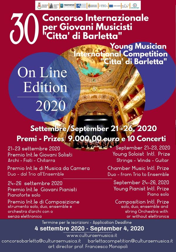 據(jù)悉,巴列塔(Barletta) 國際青年音樂家大賽以發(fā)掘具有天賦的青年音樂家們?yōu)槌踔?,啟發(fā)其藝術(shù)及音樂靈感,助推國際間的文化交流,推廣各國本土的歷史人文及風土人情。本次比賽分為器樂、鋼琴及作曲三大類,其中,器樂類設(shè)立了“管樂”“弦樂”“室內(nèi)樂”“重奏”等組別,共有來自世界多個國家的320名選手參賽。大賽為各組別最高分者以及10個特殊獎項設(shè)立了9000歐獎金,并舉辦了多場線上音樂會,展現(xiàn)獲獎選手的風采。