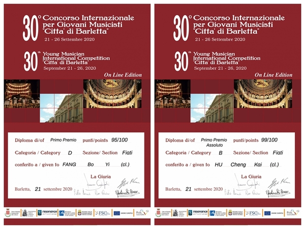 近日,在由G.CURCI文化與音樂協(xié)會舉辦的意大利第三十屆巴列塔(Barletta) 國際青年音樂家大賽圓滿落幕,我校管弦系董德君教授指導的管弦18級單簧管學生方博藝、附中初一學生胡成凱喜獲佳績,分別榮獲管樂D組、B組第一名。