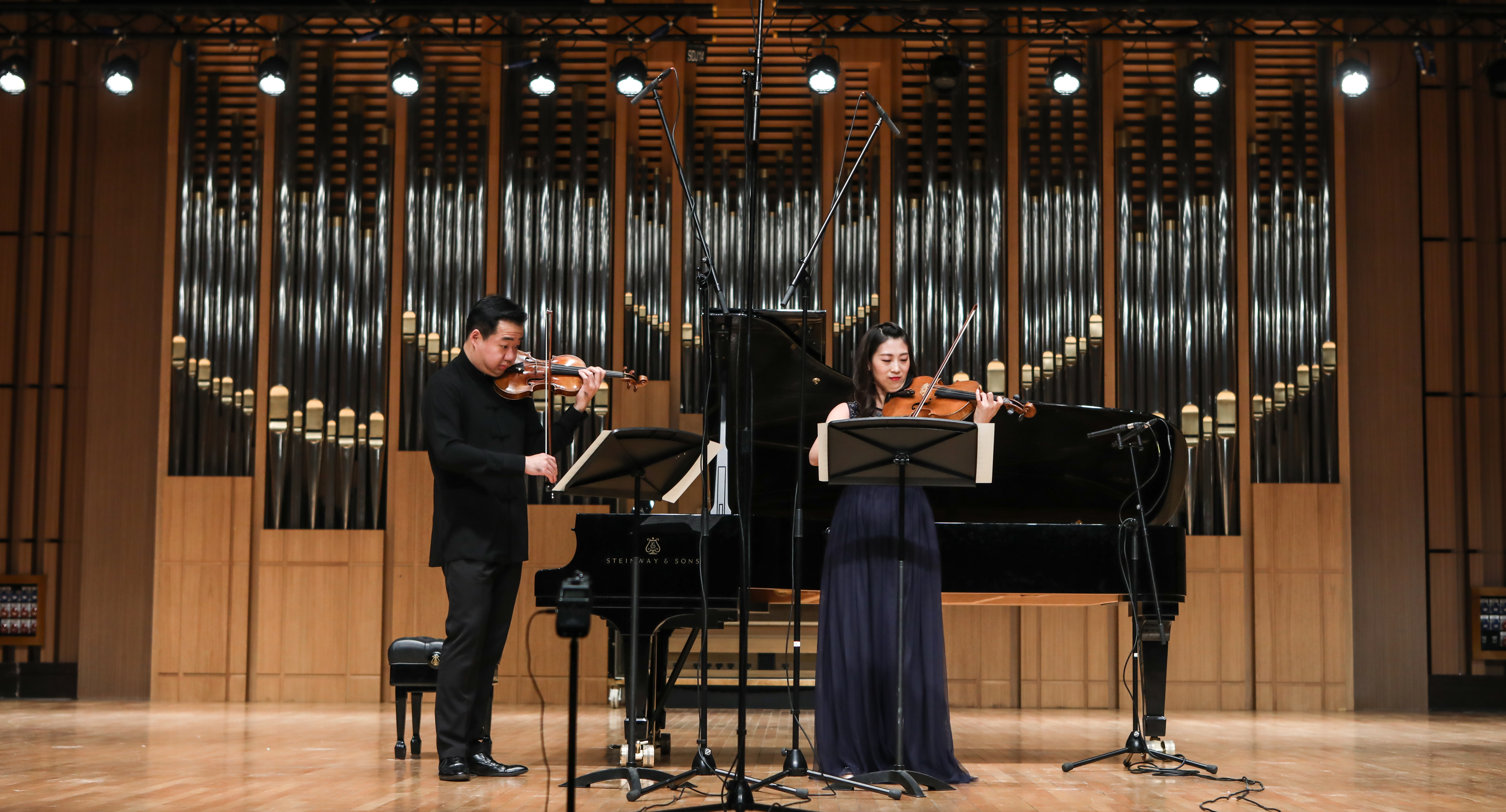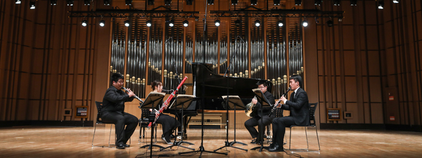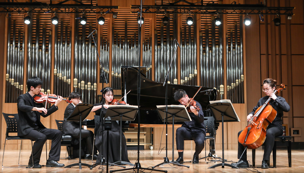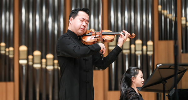音樂(lè)會(huì)在寧峰與黃秋寧兩位演奏家聯(lián)袂演奏的貝多芬F大調(diào)第五小提琴與鋼琴奏鳴曲《春天》中拉開(kāi)帷幕。兩位演奏家的演奏珠聯(lián)璧合,音色華麗而不失優(yōu)雅,征服了在場(chǎng)的每位觀眾。隨后,田益民、王曉通、鄭欣、田澤輝和盛義淳5位同學(xué)為觀眾帶來(lái)W.A.莫扎特的《降E大調(diào)鋼琴木管五重奏》,高水平的演奏將莫扎特特有的活潑靈動(dòng)發(fā)揮得淋漓盡致。中場(chǎng)休息后,寧峰、劉瓅元兩位演奏家?guī)?lái)了亨德?tīng)柕摹杜了箍ɡ麃單枨?,中提琴與小提琴在兩位演奏家的手中,音色和諧且各具特色,令觀眾們醉心其中。王宇萌、楊雙祎、張馨日3位同學(xué)演奏的W.A.莫扎特譜的《降E大調(diào)單簧管、中提琴、鋼琴“卡格斯塔特”三重奏》也相當(dāng)精彩,音樂(lè)風(fēng)格鮮明、表現(xiàn)形象生動(dòng)。音樂(lè)會(huì)最后一部作品,是由邵潤(rùn)澤、楊晨陽(yáng)、倪漢文、陳珂然和王心宇5位同學(xué)演奏的舒曼《Piano Quintet in E flat Major》(Op.44),優(yōu)美的樂(lè)曲在音樂(lè)廳回蕩共鳴,感染力十足。