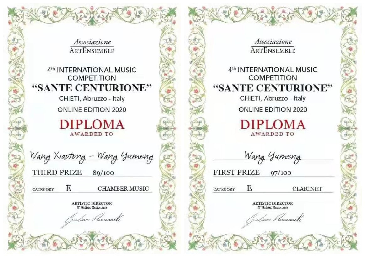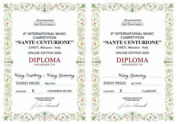 近日,在第四屆“sante centurione”國(guó)際音樂(lè)比賽(線上)中,學(xué)院管弦系學(xué)生王曉通、王宇萌在董德君教授和藝術(shù)指導(dǎo)齊笑怡的指導(dǎo)下喜獲佳績(jī)。王曉通、王宇萌獲得室內(nèi)樂(lè)E組第三名(第一、二名空缺),王宇萌獲得器樂(lè)專業(yè)E組第一名,這也是室內(nèi)樂(lè)學(xué)院學(xué)生再次榮獲國(guó)際比賽獎(jiǎng)項(xiàng)。