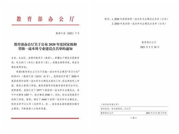 據(jù)悉,一流本科專業(yè)建設(shè)“雙萬(wàn)計(jì)劃”是教育部全面振興本科教育、提高高校人才培養(yǎng)能力、實(shí)現(xiàn)高等教育內(nèi)涵式發(fā)展的重要舉措,自2019年起分3年建設(shè)10000個(gè)左右國(guó)家級(jí)一流本科專業(yè)點(diǎn)和10000個(gè)左右省級(jí)一流本科專業(yè)點(diǎn)。2020年度為第二次申報(bào),經(jīng)過(guò)全國(guó)各高校申報(bào)、高校主管部門審核、教育部高等學(xué)校教學(xué)指導(dǎo)委員會(huì)評(píng)議、投票,最終教育部共認(rèn)定3977個(gè)國(guó)家級(jí)一流本科專業(yè)建設(shè)點(diǎn)及4448個(gè)省級(jí)一流本科專業(yè)建設(shè)點(diǎn)。