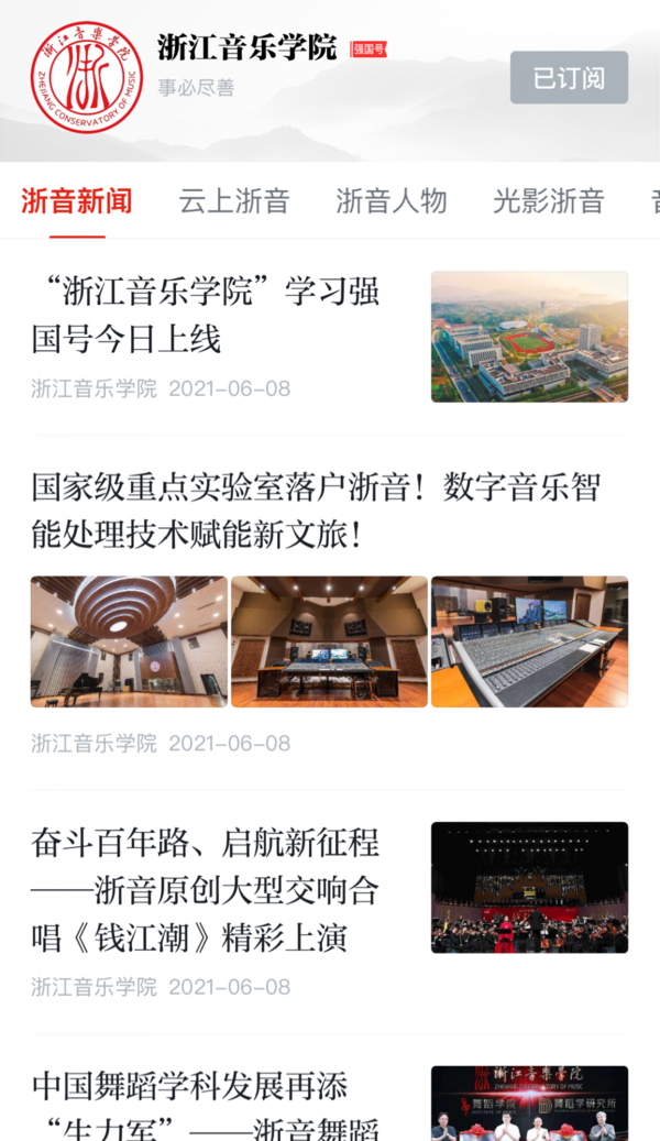 “浙江音樂學(xué)院”學(xué)習(xí)強(qiáng)國號(hào)開設(shè)“浙音新聞”“云上浙音”“浙音人物”“光影浙音”“音樂課堂”五個(gè)欄目。通過強(qiáng)國號(hào),讀者可以及時(shí)了解學(xué)院在黨建思政、人才培養(yǎng)、藝術(shù)創(chuàng)作、文化傳承、社會(huì)服務(wù)等方面的最新探索和實(shí)踐成果,感受浙音師生勇于擔(dān)當(dāng)新時(shí)代藝術(shù)使命的精神風(fēng)貌。