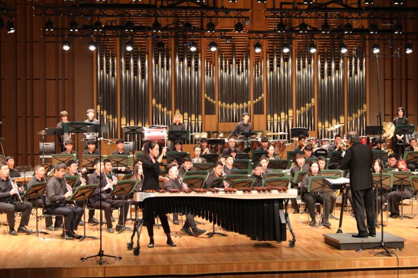 音樂會在莊嚴(yán)肅穆的《中華人民共和國國歌》中拉開帷幕。隨后,大氣磅礴、振奮人心的《紅旗頌》,仿佛把聽眾帶回到中華人民共和國成立之時,第一面五星紅旗冉冉升起的場景。緊接著,由日本作曲家八木澤教司為我國著名單簧管教育家席偉瀧教授創(chuàng)作的《七彩丹霞》,把大家?guī)雺验煱邤?、童話般的美麗魔幻世界。而青年打擊樂教師林喆與交響管樂團(tuán)合作的《威廉·退爾》序曲,以及青春洋溢、熱情似火的《熱情大陸》將現(xiàn)場氣氛推向高潮,獲得了觀眾熱烈的掌聲。音樂會還演繹了著名作曲家于建芳編曲的《我的祖國》《茉莉花香云天外》《紅色的記憶》《難忘今宵》和Rob Romeyn的《ZES:KING OF THE GODS》等交響管樂經(jīng)典曲目。其中《紅色的記憶》是作曲家將《紅星歌》《翻身道情》《我愛北京天安門》等歌曲進(jìn)行編創(chuàng),由4支木管與管樂隊(duì)合作演奏。最后,一曲《難忘今宵》為音樂會落下帷幕,現(xiàn)場久久回蕩著觀眾們雷鳴般的掌聲。