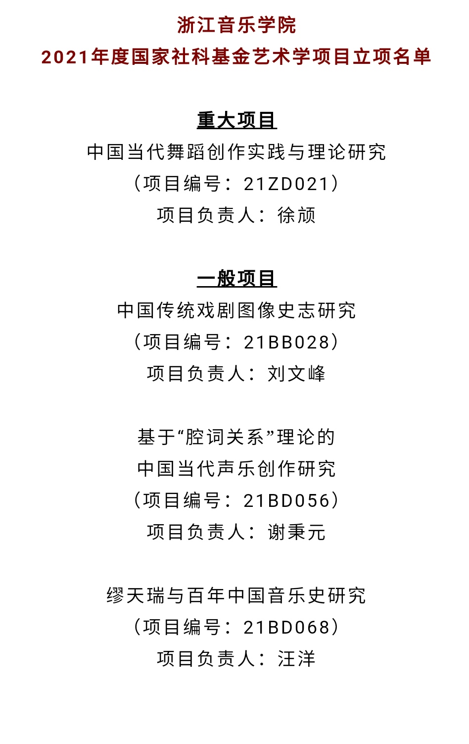 近日,全國(guó)藝術(shù)科學(xué)規(guī)劃領(lǐng)導(dǎo)小組辦公室公布2021年度國(guó)家社科基金藝術(shù)學(xué)項(xiàng)目立項(xiàng)名單,學(xué)院教師徐頏負(fù)責(zé)的“中國(guó)當(dāng)代舞蹈創(chuàng)作實(shí)踐與理論研究”獲批重大項(xiàng)目,劉文峰負(fù)責(zé)的“中國(guó)傳統(tǒng)戲劇圖像史志研究”、謝秉元負(fù)責(zé)的“基于‘腔詞關(guān)系’理論的中國(guó)當(dāng)代聲樂創(chuàng)作研究”和汪洋負(fù)責(zé)的“繆天瑞與百年中國(guó)音樂史研究”獲批一般項(xiàng)目。