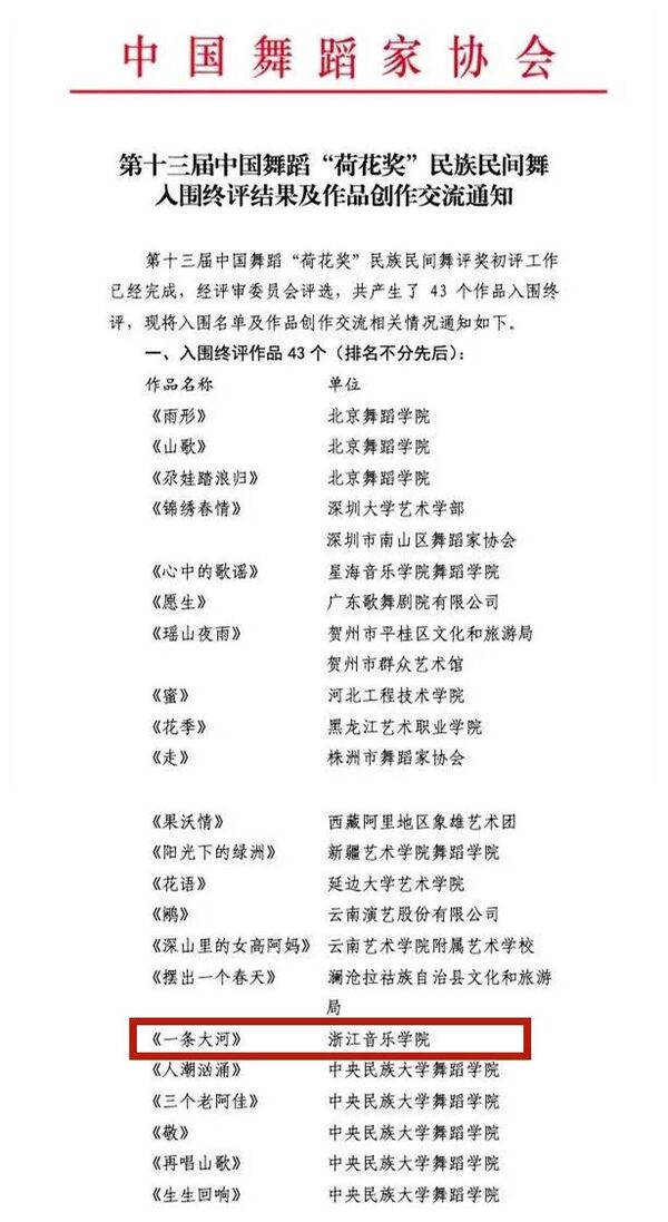 日前,第十三屆中國舞蹈“荷花獎(jiǎng)”民族民間舞入圍終評結(jié)果揭曉,學(xué)院舞蹈學(xué)院作品《一條大河》入圍。
