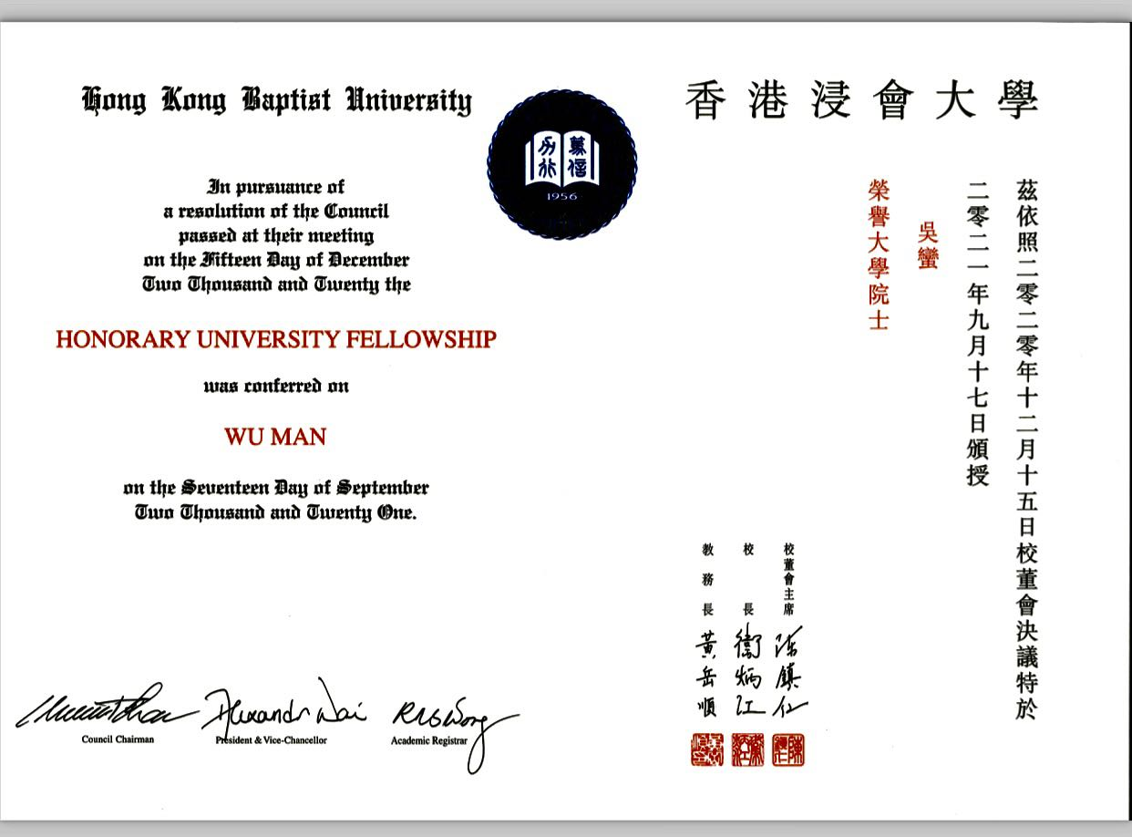 9月17日,香港浸會(huì)大學(xué)宣布授予學(xué)院特聘教授、國(guó)際著名琵琶演奏家吳蠻榮譽(yù)大學(xué)院士。這是吳蠻今年新獲的第二項(xiàng)殊榮。5月20日,美國(guó)新英格蘭音樂(lè)學(xué)院授予她榮譽(yù)音樂(lè)博士,表彰其琵琶演奏藝術(shù)在國(guó)際的影響力以及對(duì)世界音樂(lè)領(lǐng)域的杰出貢獻(xiàn)。