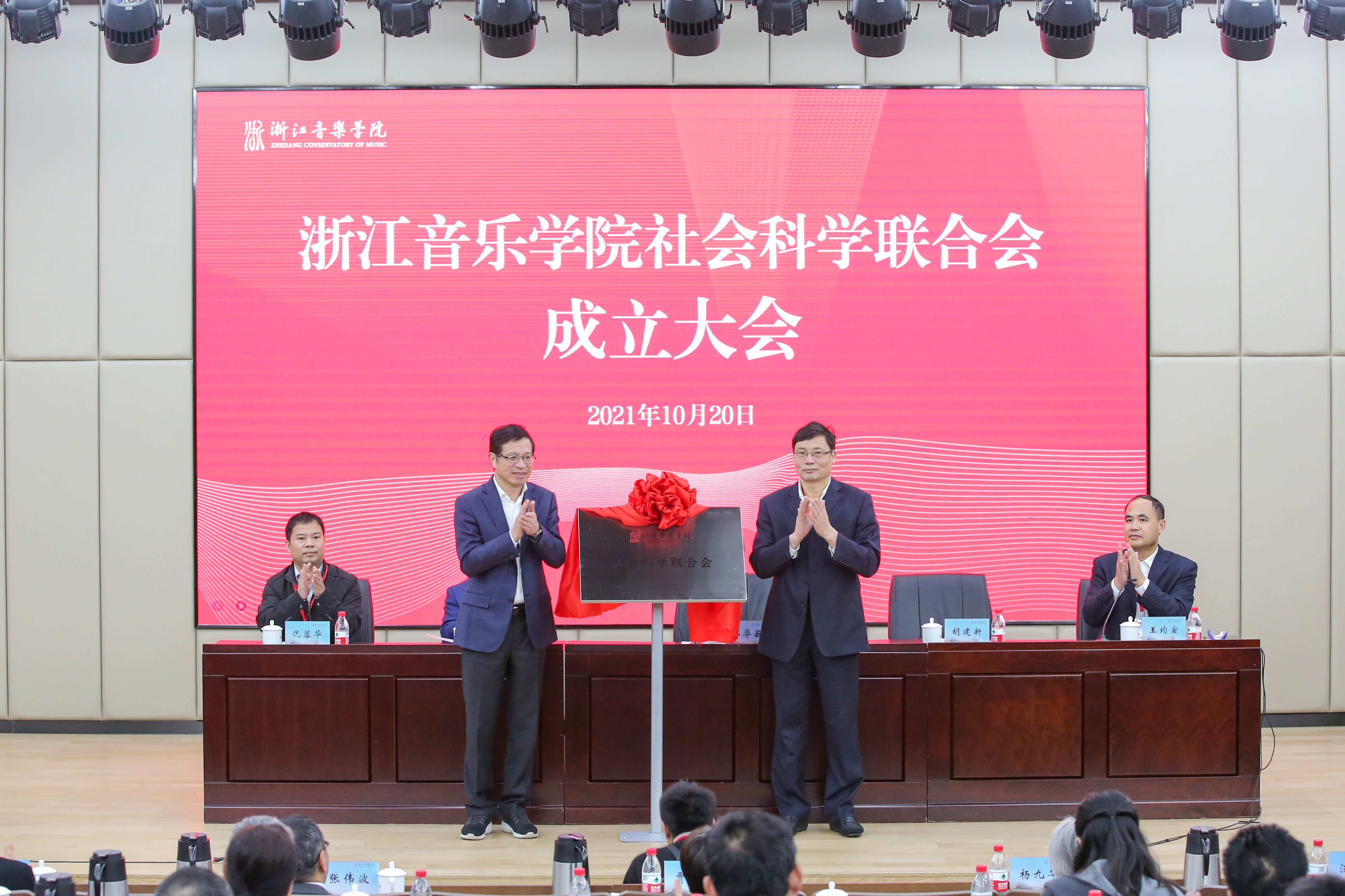 郭華巍、胡建新共同為“浙江音樂(lè)學(xué)院社會(huì)科學(xué)聯(lián)合會(huì)”揭牌。省社科聯(lián)規(guī)劃處四級(jí)調(diào)研員況落華宣讀了“關(guān)于同意浙江音樂(lè)學(xué)院成立社科聯(lián)”的批復(fù)。