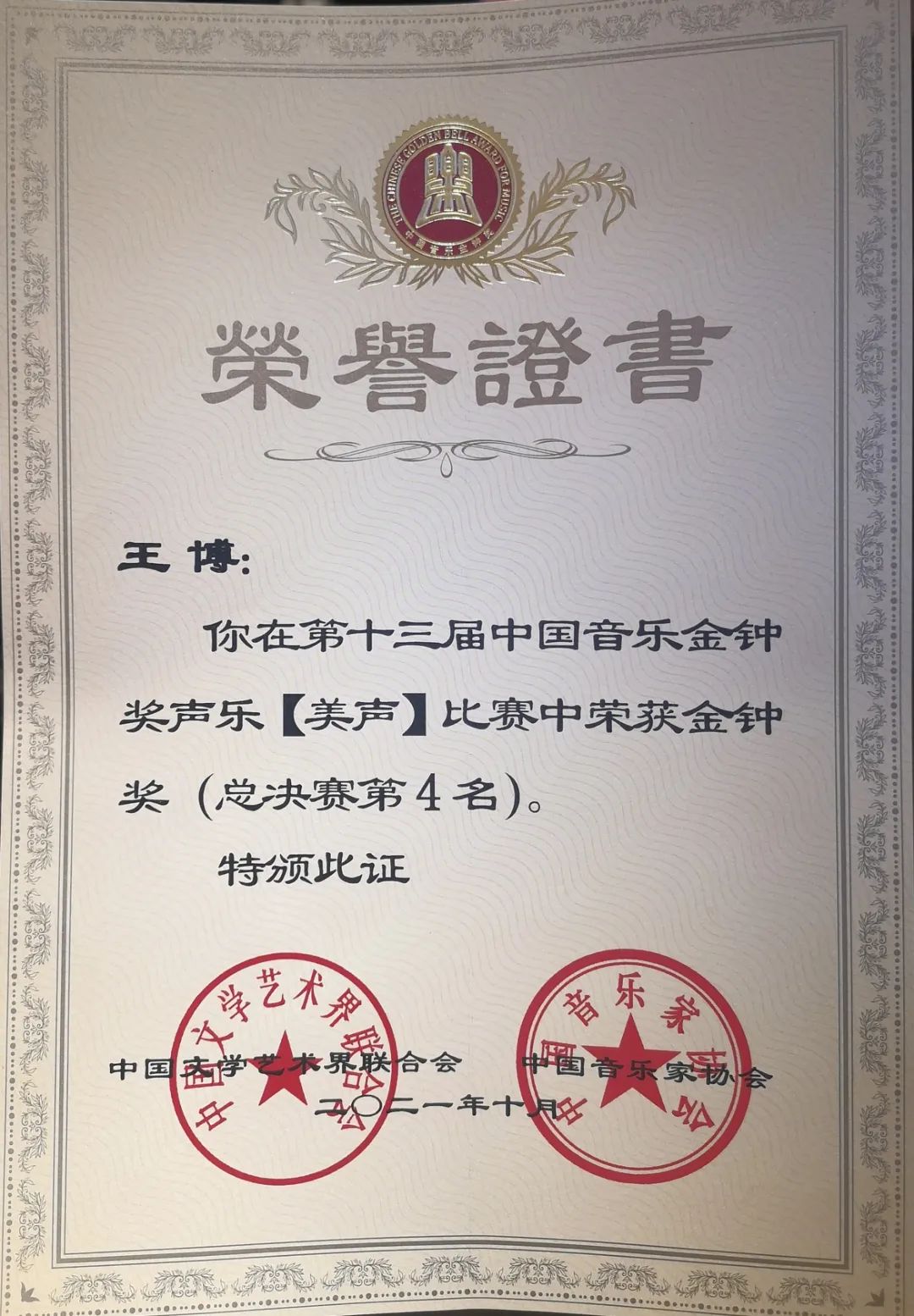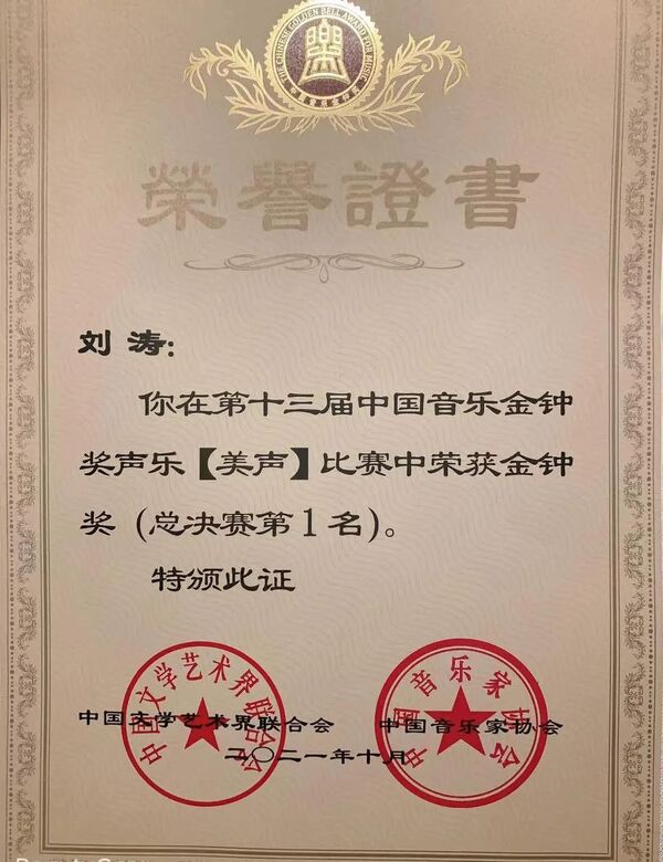 10月24日,在剛剛結(jié)束的第十三屆中國(guó)音樂金鐘獎(jiǎng)美聲組總決賽中,學(xué)院青年教師劉濤以98.29分榮獲第一名,聲樂歌劇系本科四年級(jí)學(xué)生王博(指導(dǎo)教師陶維龍、藝術(shù)指導(dǎo)金麥克)以97.58分榮獲并列第四名,雙雙奪得金鐘獎(jiǎng),在5名金鐘獎(jiǎng)獲獎(jiǎng)?wù)咧姓紦?jù)2個(gè)席位。