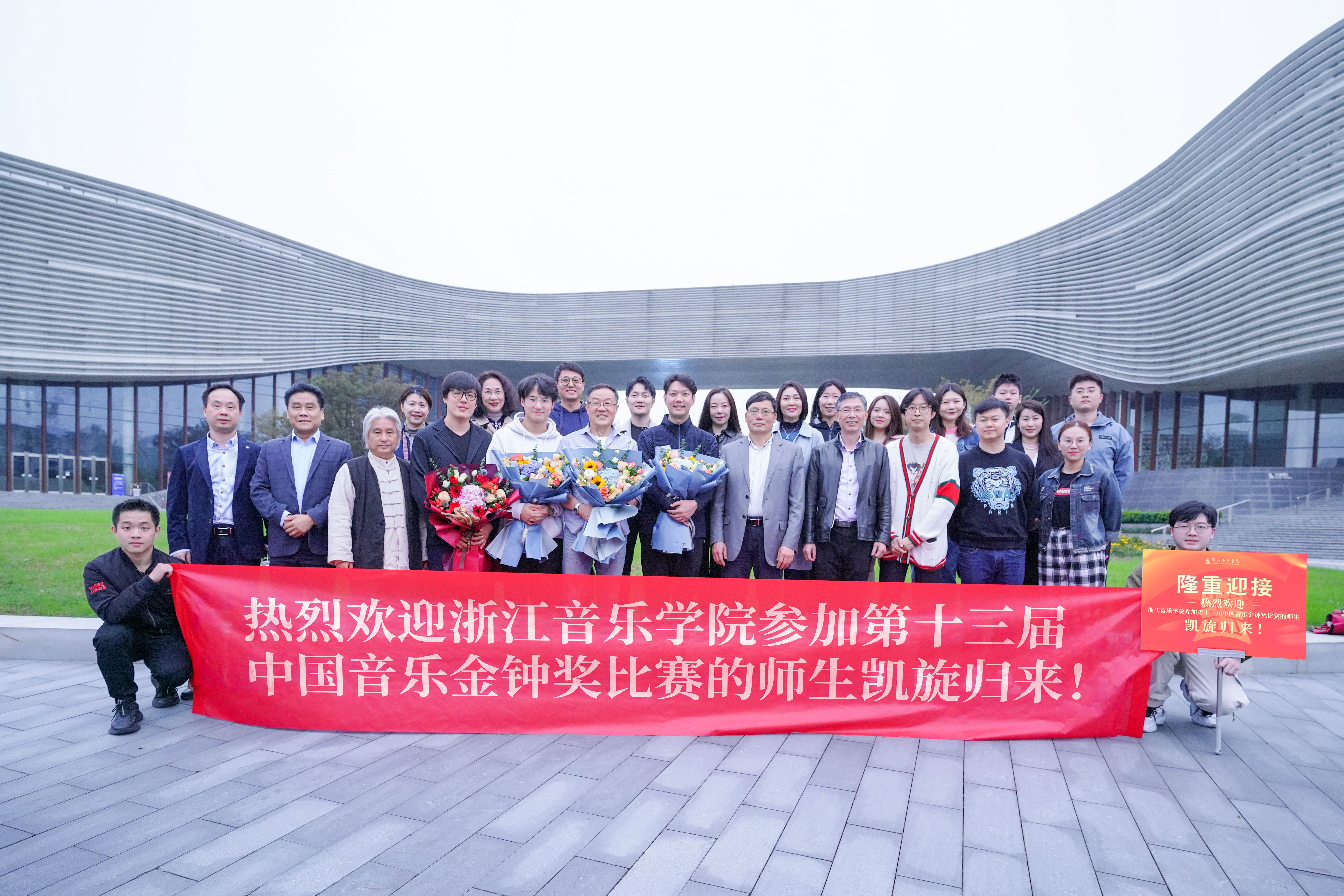 百年華誕,盛世金鐘,浙音“金鐘之星”冉冉升起。10月27日下午,參加第十三屆中國(guó)音樂金鐘獎(jiǎng)師生回到杭州,黨委書記胡建新在學(xué)院北門迎接獲獎(jiǎng)?wù)邉P旋,并為第十三屆中國(guó)音樂金鐘獎(jiǎng)美聲組獲獎(jiǎng)?wù)邉?、王博,以及王博的指?dǎo)教師陶維龍、藝術(shù)指導(dǎo)金麥克送上鮮花。副院長(zhǎng)楊九華前往機(jī)場(chǎng)迎接,辦公室、教務(wù)處、聲樂歌劇系負(fù)責(zé)人陪同。