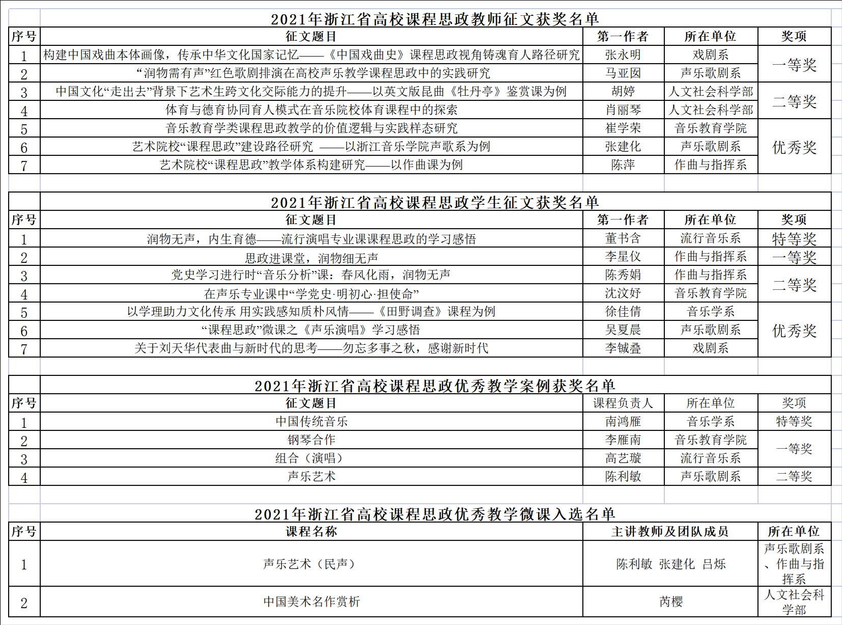 學院高度重視課程思政建設,出臺了《浙江音樂學院課程思政建設實施方案》,按照“價值引領、能力達成、知識傳授”的總體要求,以“三全育人、彰顯特色、樹立典型”為基本思路,深化課程思政教學改革,充分發(fā)揮課堂教學主渠道作用,深挖各類專業(yè)課程育人功能,全力推進全員全過程全方位育人。在各部門(系部)的不斷努力下,學院課程思政建設成效顯著。截至目前,學院已獲批教育部課程思政示范項目1項、教學團隊1個、教學名師7名,省級課程思政示范課程4門、教學研究項目6項、示范基層教學組織1個。學院還將以此為契機,進一步深化教學改革,加強課程思政建設,深挖各類課程的思政元素和價值元素,打造具有浙音特色的課程思政教學體系。