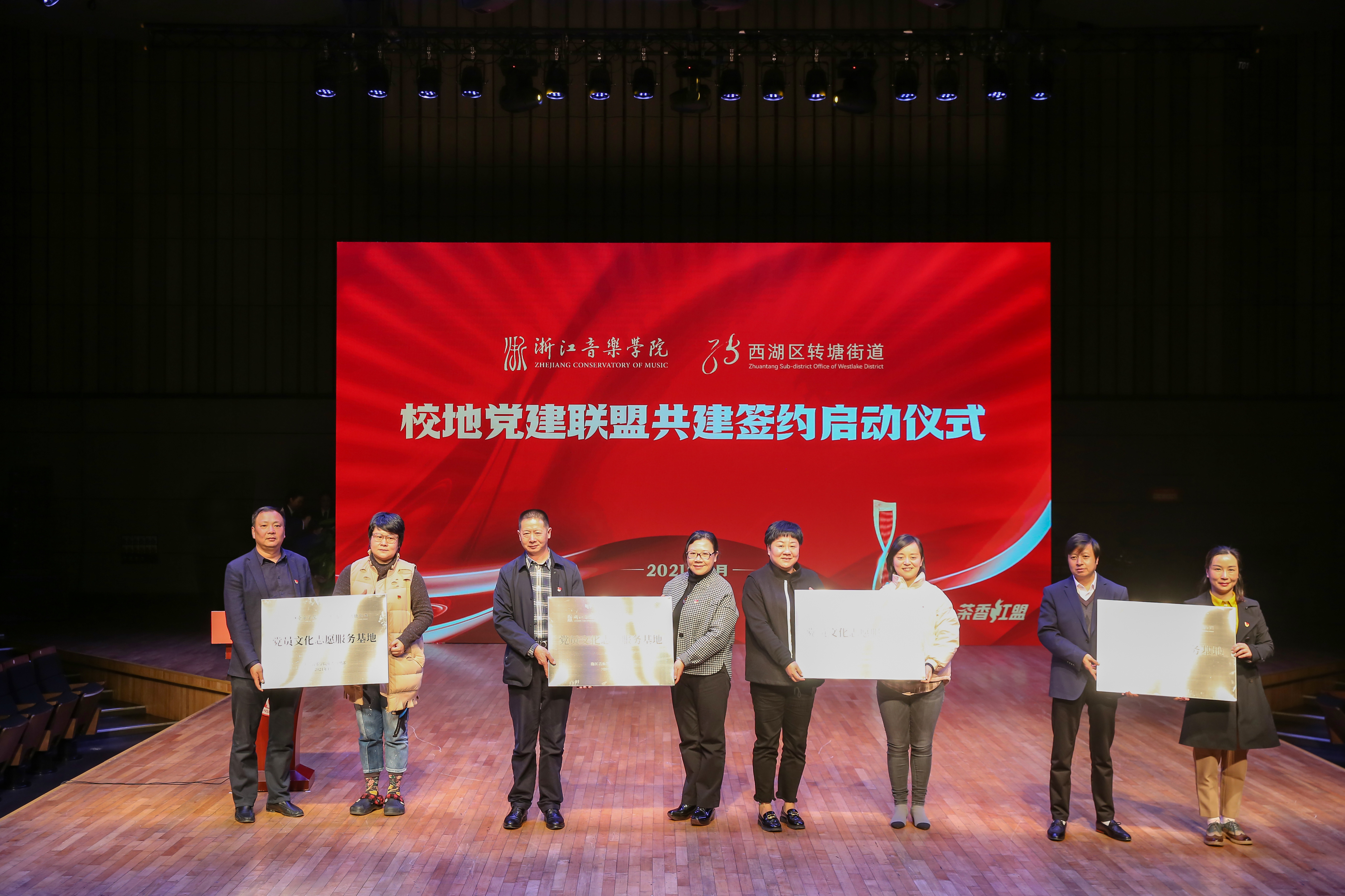 奚麗萍和沈劍共同簽署校地黨建聯(lián)盟共建協(xié)議書。學院11個二級黨組織為轉塘街道11個村社支部授牌。領導嘉賓共同點亮“浙江音樂學院與轉塘街道黨建聯(lián)盟”大屏。啟動儀式前,校地以“紅色樂音 賦能鄉(xiāng)村”為主題在何家村文化大禮堂共同開展了一次主題黨日活動。