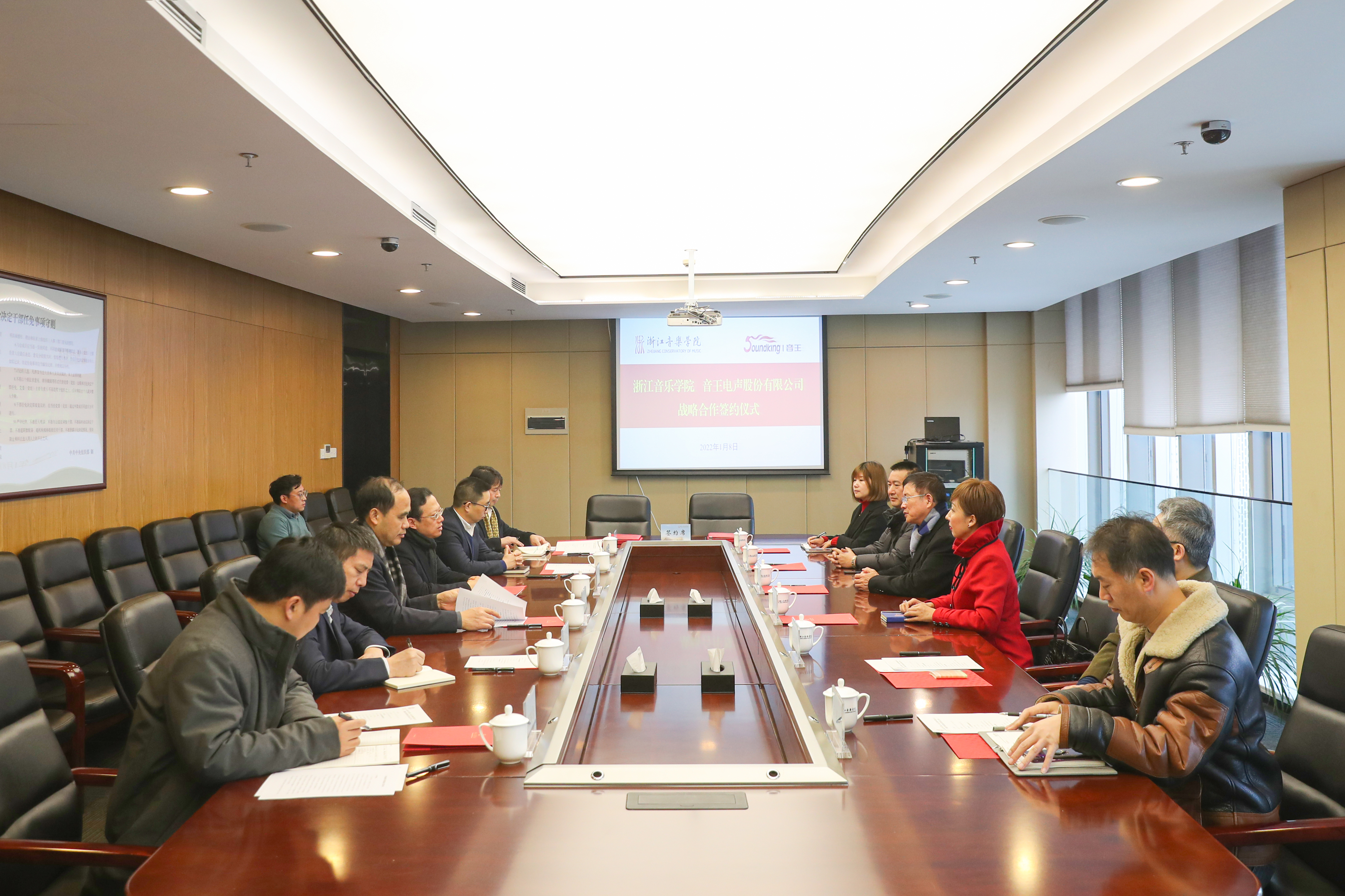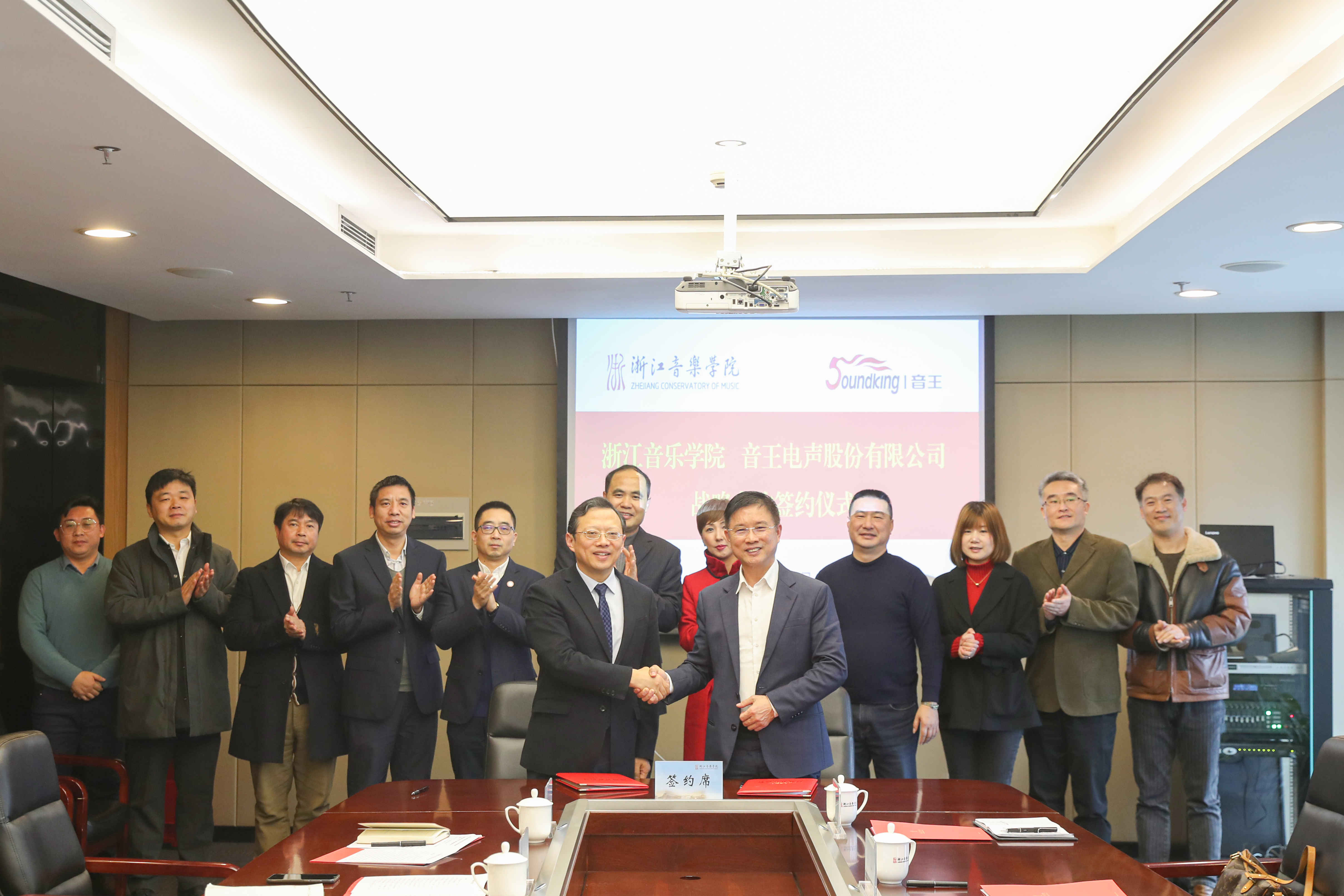 為貫徹落實(shí)省委文化工作會(huì)議精神,助力新時(shí)代文化浙江工程建設(shè),深入推進(jìn)校企協(xié)同創(chuàng)新和協(xié)同育人,1月8日上午,學(xué)院與音王電聲股份有限公司在行政樓1003會(huì)議室簽署戰(zhàn)略合作框架協(xié)議。學(xué)院黨委書記胡建新接見了音王一行,院長(zhǎng)王瑞、黨委副書記王均寅、副院長(zhǎng)汪洋,音王電聲股份有限公司董事長(zhǎng)王祥貴、執(zhí)行總裁陳眾、副總裁曹山,以及學(xué)院相關(guān)職能部門、音王相關(guān)部門負(fù)責(zé)人出席簽約儀式。