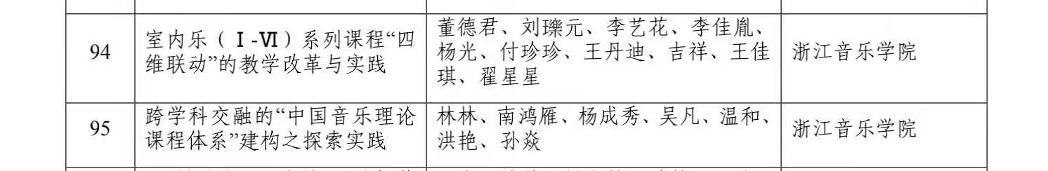 近日,浙江省教育廳下發(fā)《關(guān)于公布2021年省教學(xué)成果獎(jiǎng)名單的通知》(浙教函〔2022〕10 號(hào)),學(xué)院共有4項(xiàng)成果獲獎(jiǎng)(一等獎(jiǎng)2項(xiàng)、二等獎(jiǎng)2項(xiàng)),實(shí)現(xiàn)了歷史性重大突破,獲獎(jiǎng)數(shù)位列浙江省本科高校前列。其中,由楊九華教授作為主要完成人的“以新文科為導(dǎo)向的西方音樂課程體系建設(shè)與創(chuàng)新”,由張?jiān)屏冀淌谧鳛橹饕瓿扇说?ldquo;‘學(xué)演貫通、舞臺(tái)淬礪、產(chǎn)學(xué)相融’的表演類專業(yè)實(shí)踐教學(xué)改革與探索”獲高等教育教學(xué)成果獎(jiǎng)一等獎(jiǎng);由董德君教授作為主要完成人的“室內(nèi)樂(Ⅰ-Ⅵ)系列課程‘四維聯(lián)動(dòng)’的教學(xué)改革與實(shí)踐”,由林林教授作為主要完成人的“跨學(xué)科交融的‘中國音樂理論課程體系’建構(gòu)之探索實(shí)踐”獲高等教育教學(xué)成果獎(jiǎng)二等獎(jiǎng)。