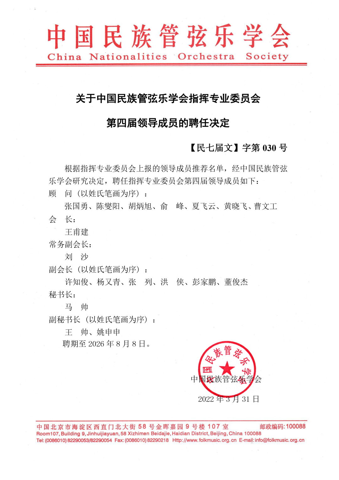 3月31日,中國民族管弦樂學會指揮專業(yè)委員會換屆大會在京召開。學院民族樂隊學院藝術總監(jiān)、院長,國樂系主任王甫建教授連任中國民族管弦樂學會指揮專業(yè)委員會會長。