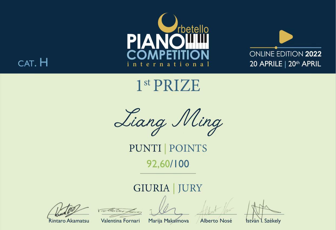 近日,意大利奧貝雷洛國(guó)際鋼琴比賽公布結(jié)果,學(xué)院鋼琴系研究生明亮(指導(dǎo)教師金瀚文、朱昊)榮獲比賽第一名。明亮2015年起師從第七屆金鐘獎(jiǎng)金獎(jiǎng)、第五屆安東·魯賓斯坦金獎(jiǎng)得主、鋼琴系青年教師朱昊,學(xué)習(xí)期間專業(yè)成績(jī)優(yōu)秀,獲得匈牙利李斯特音樂學(xué)院公費(fèi)留學(xué)資格,并于2022年入選李叔同學(xué)院“拔尖人才培養(yǎng)計(jì)劃”。